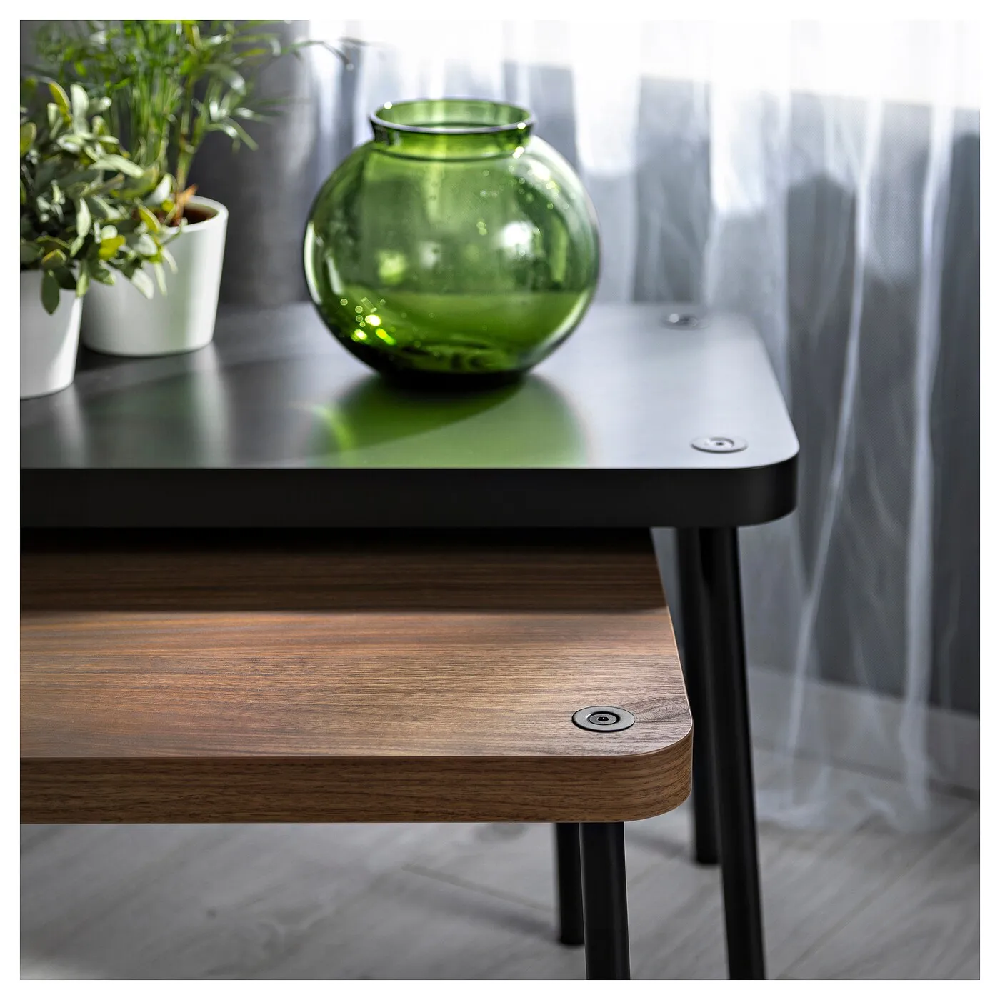 Смело экспериментируйте с 2 столиками SONHULT. Меняйте стиль и настроение, просто меняя ножки местами.
