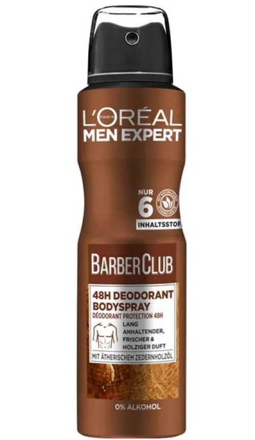 Дезодорант L'Oreal Men Expert Barber Club обеспечивает защиту от запаха и пота до 48 часов, имеет свежий древесный аромат с нотами кедрового масла и не содержит алюминия и спирта, что делает его подходящим для чувствительной кожи.