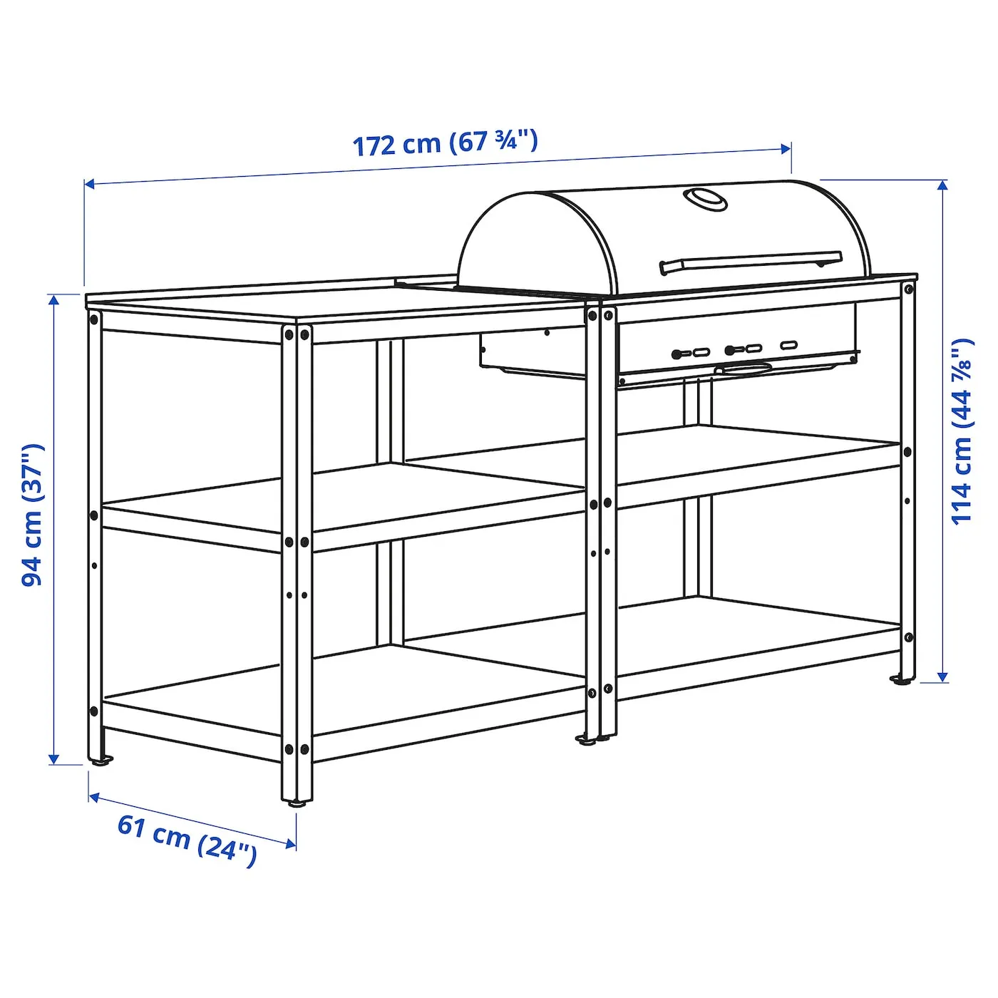На полках под грилем можно разместить аксессуары, утварь, сервировочные блюда и другие необходимые для подачи горячих блюд предметы.