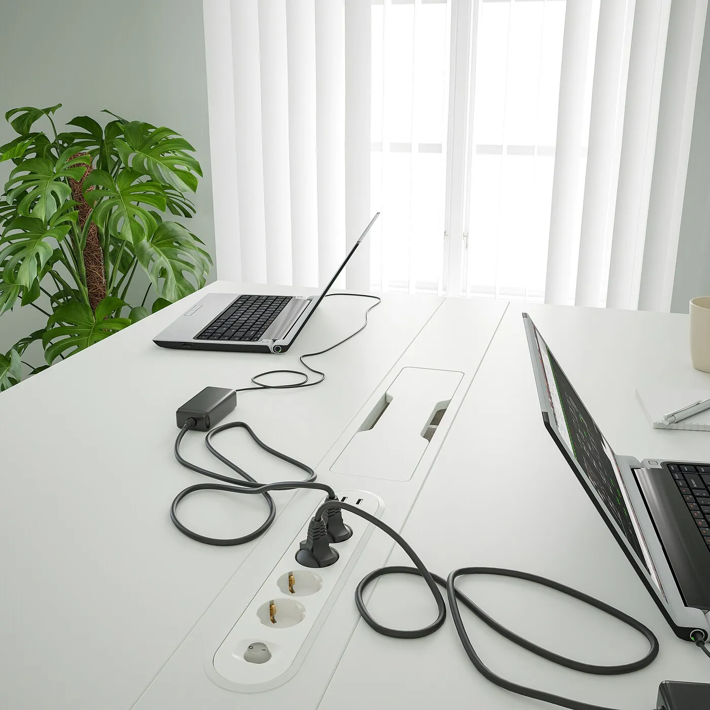 Модуль управления кабелями включен, поэтому вы можете оставаться на связи во время работы. Совместим с розетками по всему миру, доступен сверху.