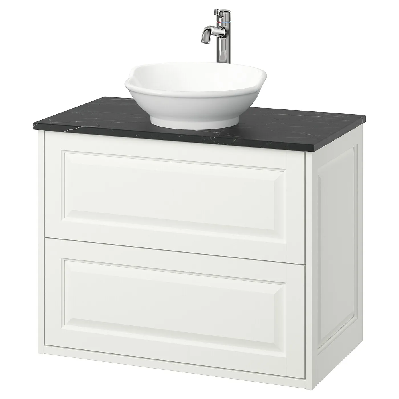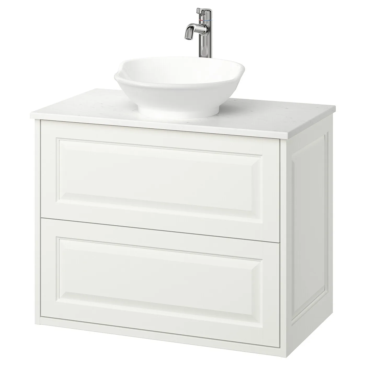 Фурнитура для ванной TÄNNFORSEN олицетворяет классическую элегантность с фасками. Этот комплект с рабочей поверхностью и круглым умывальником с приподнятой задней частью создает красивый центр, похожий на предмет искусства.