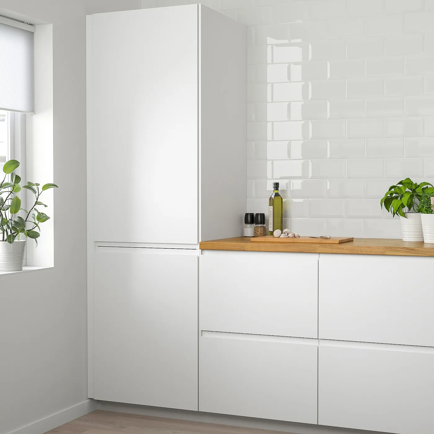 Фасады VOXTORP с матовой белой поверхностью придают современный вид и создают ощущение света и простора. Встроенные ручки идеально вписываются в дизайн, подчеркивая минимализм.