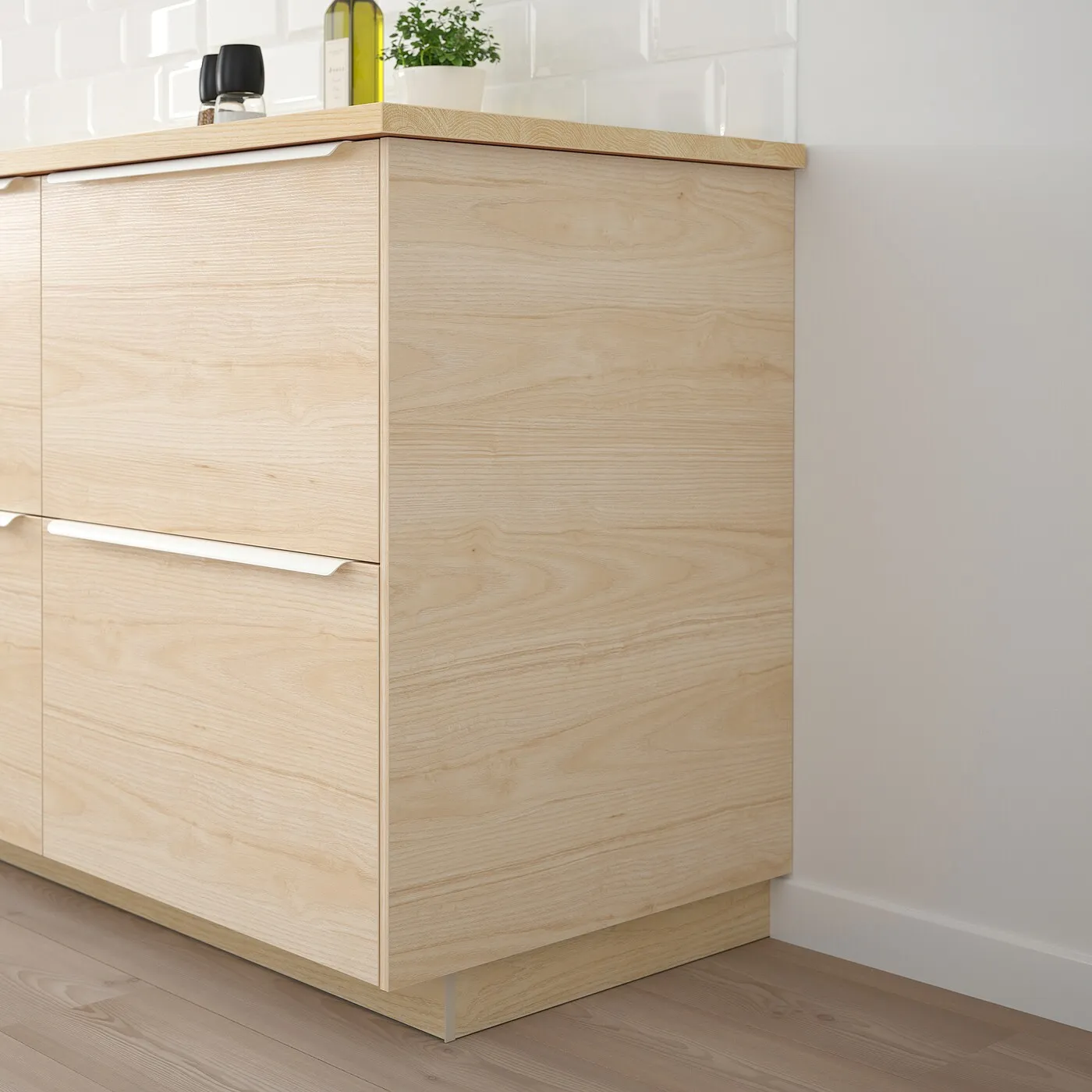 Фасады ASKERSUND сочетают в себе красоту и практичность. Легко моющаяся поверхность из меламина устойчива к влаге, царапинам и ударам, а рисунок под светлый ясень выглядит и ощущается естественно и выразительно.