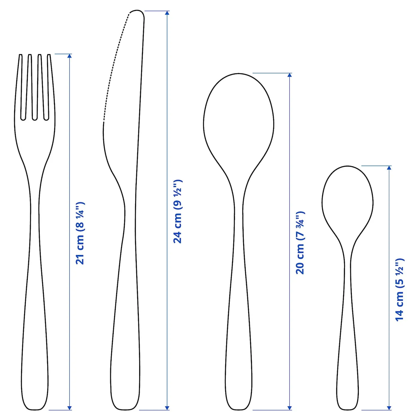 Состав: вилка, нож, ложка и чайная ложка, по 6 штук каждого.