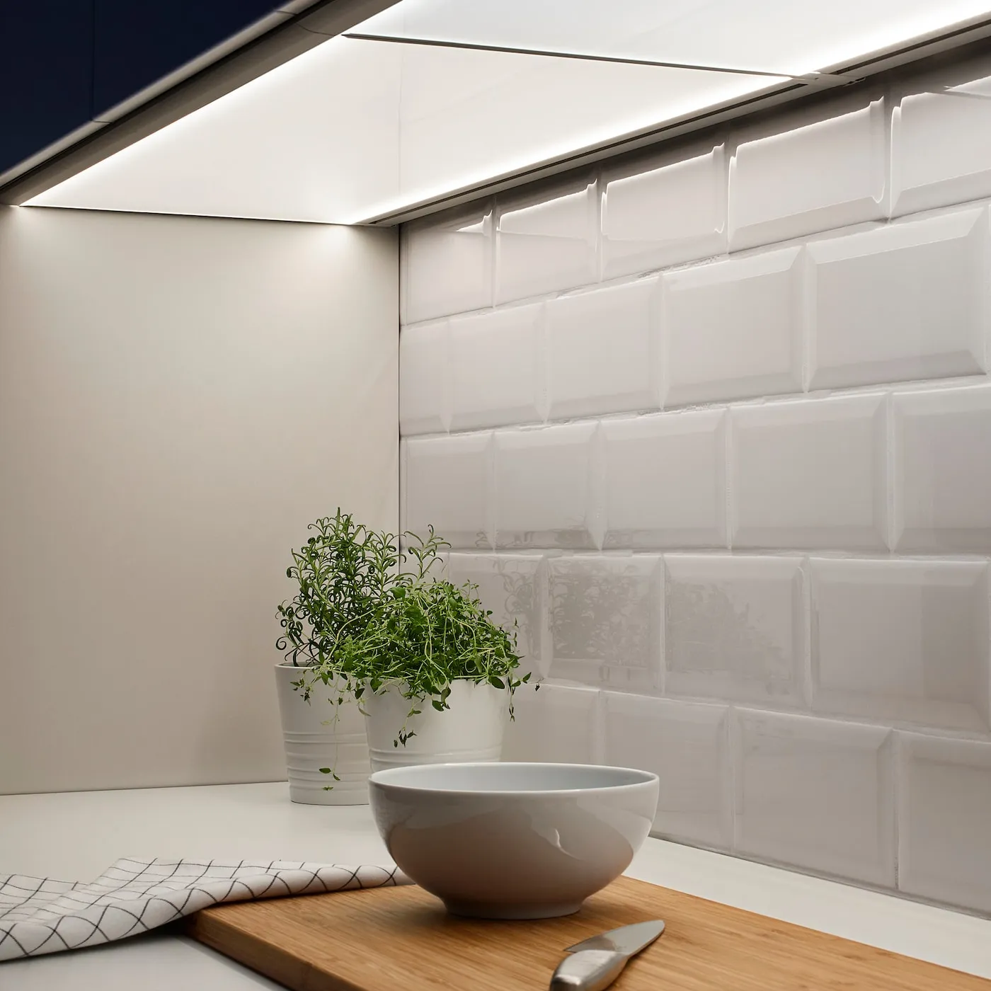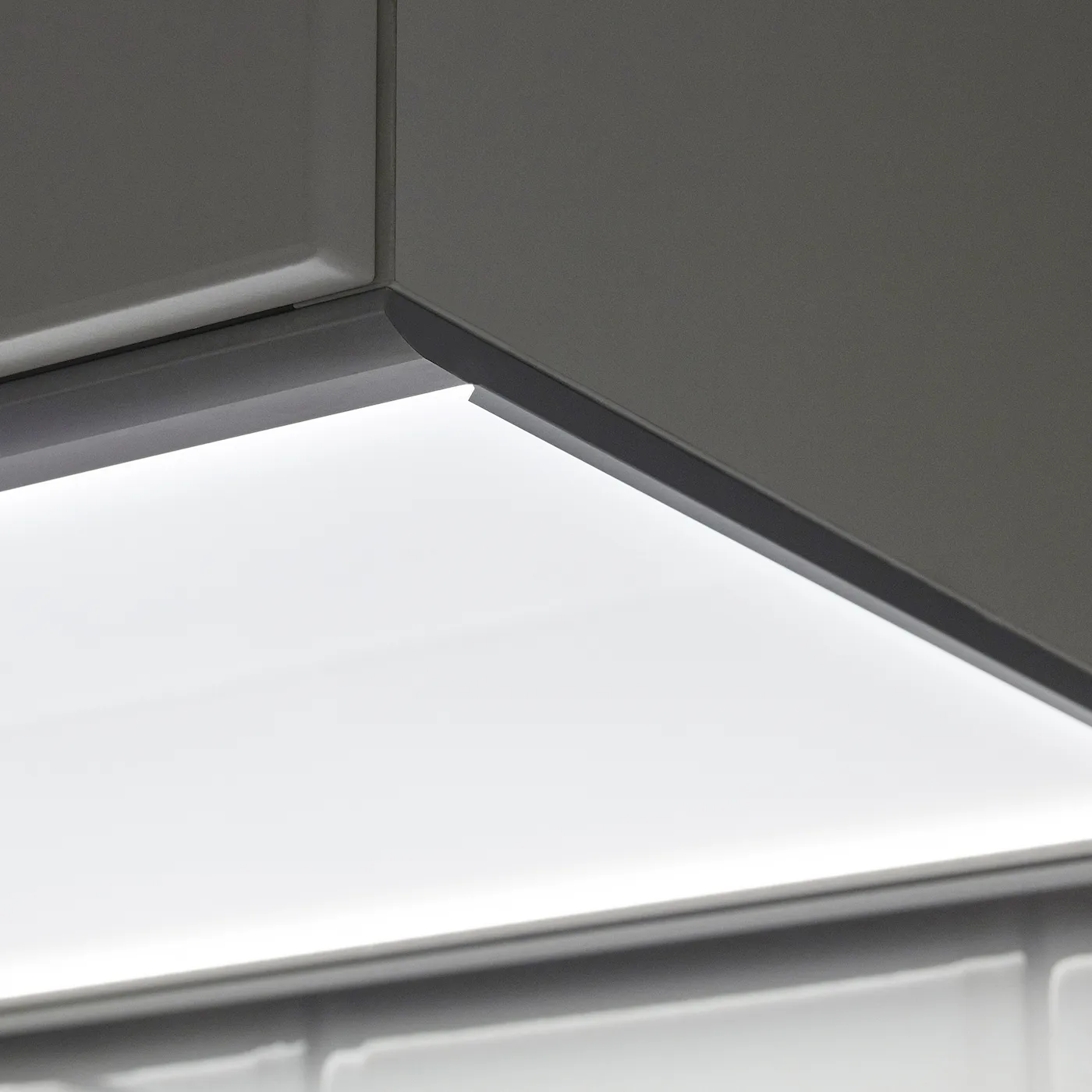 Панель закрывает нижнюю часть навесного шкафа и равномерно распределяет свет на рабочей поверхности, исключая тени. Современный дизайн, который добавляет атмосферу и облегчает работу на кухне.