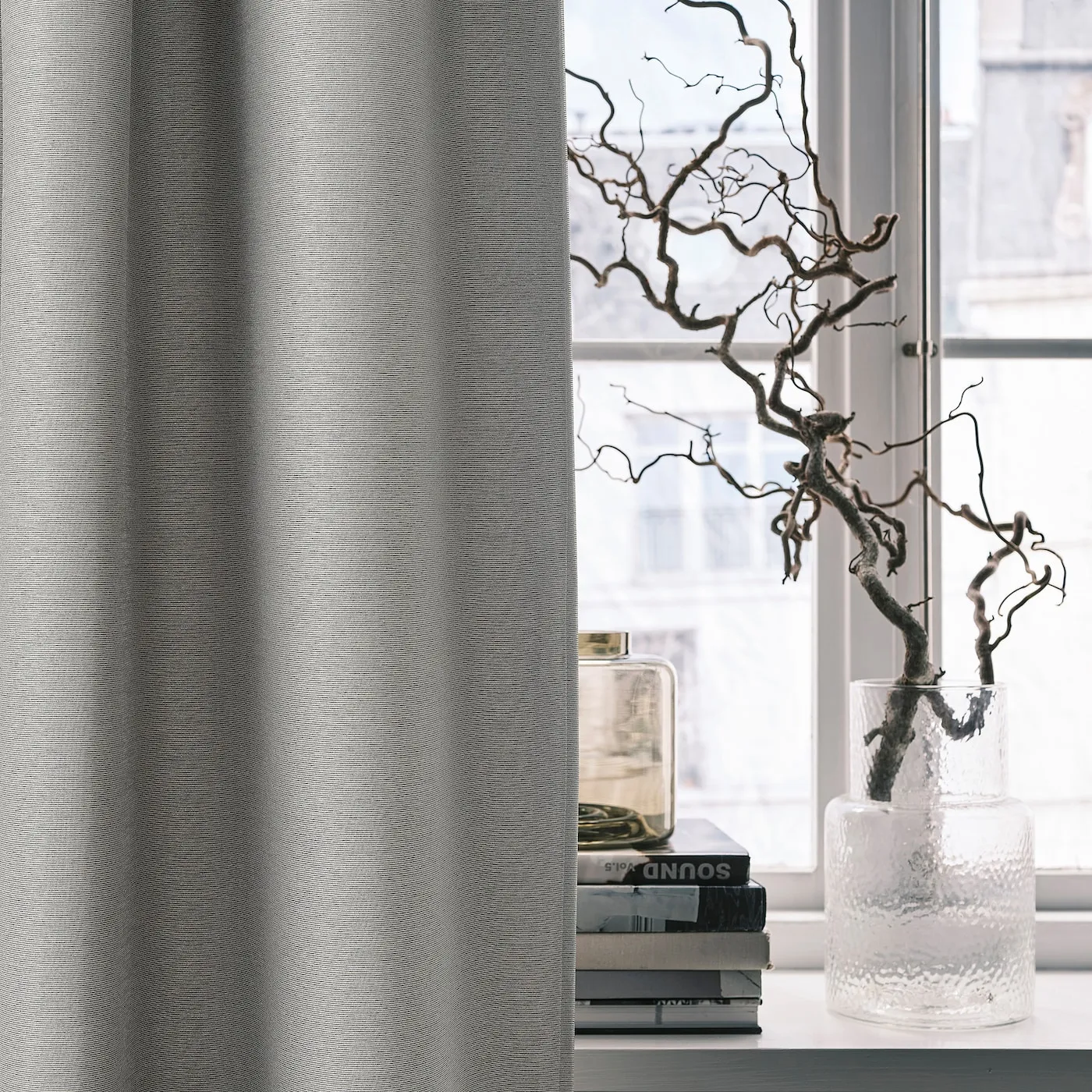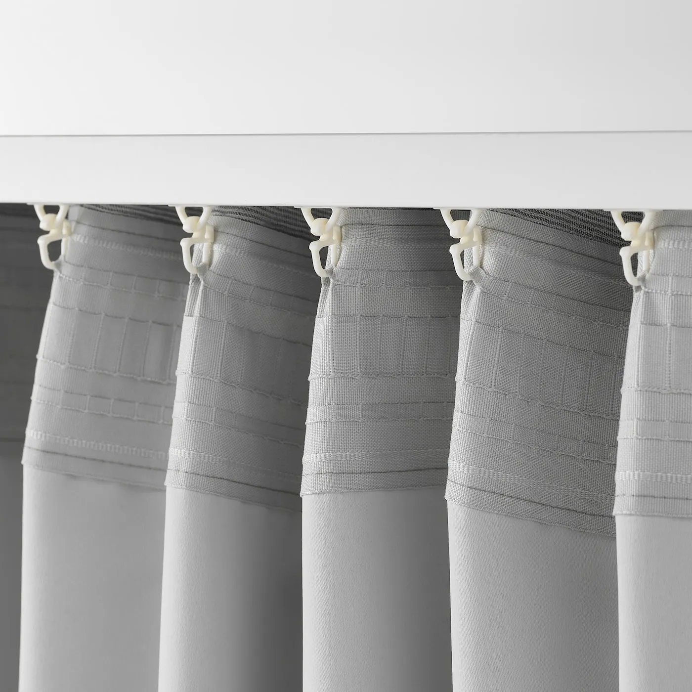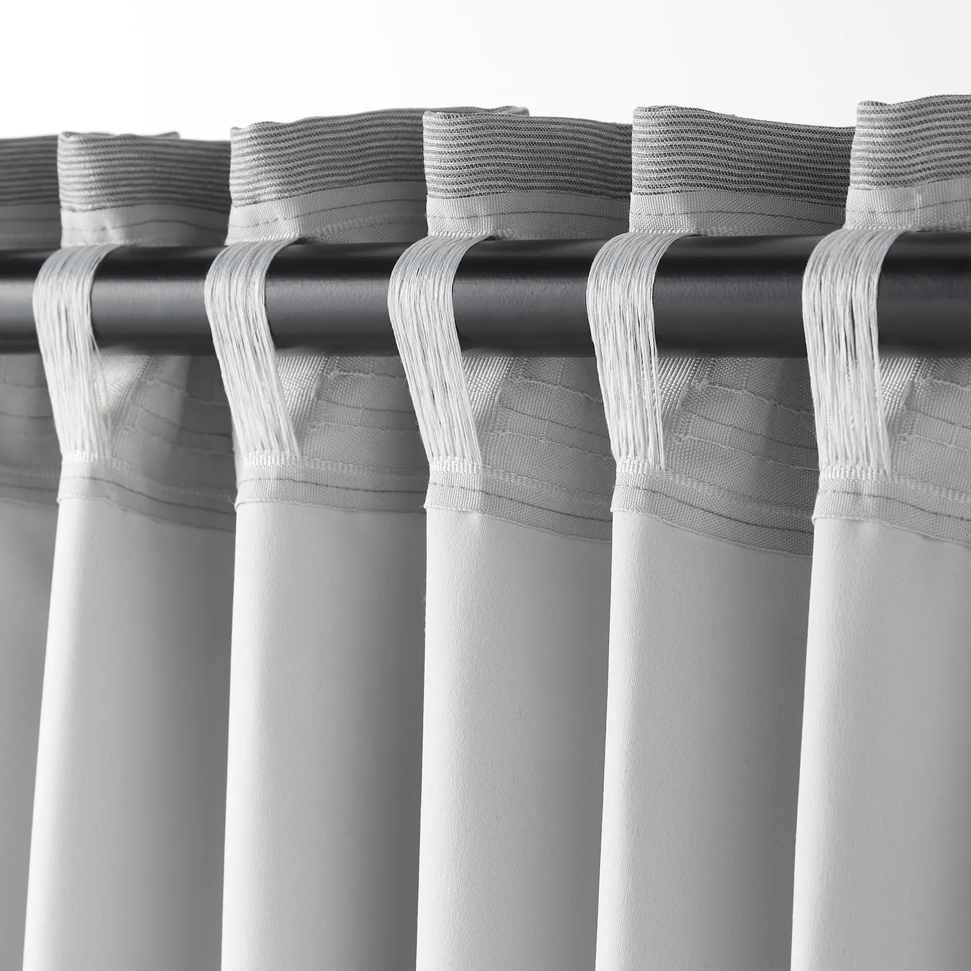 Серые затемняющие шторы VILBORG с линейной текстурой. Прочная, легкая в уходе ткань изолирует и затемняет помещение, не утяжеляя его. Лента для подвеса позволяет использовать разные способы крепления.