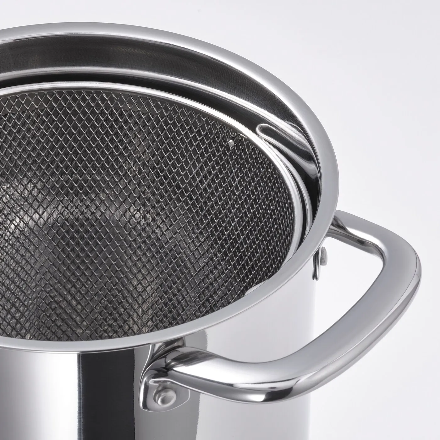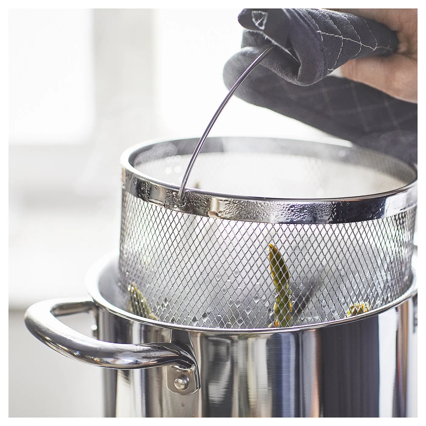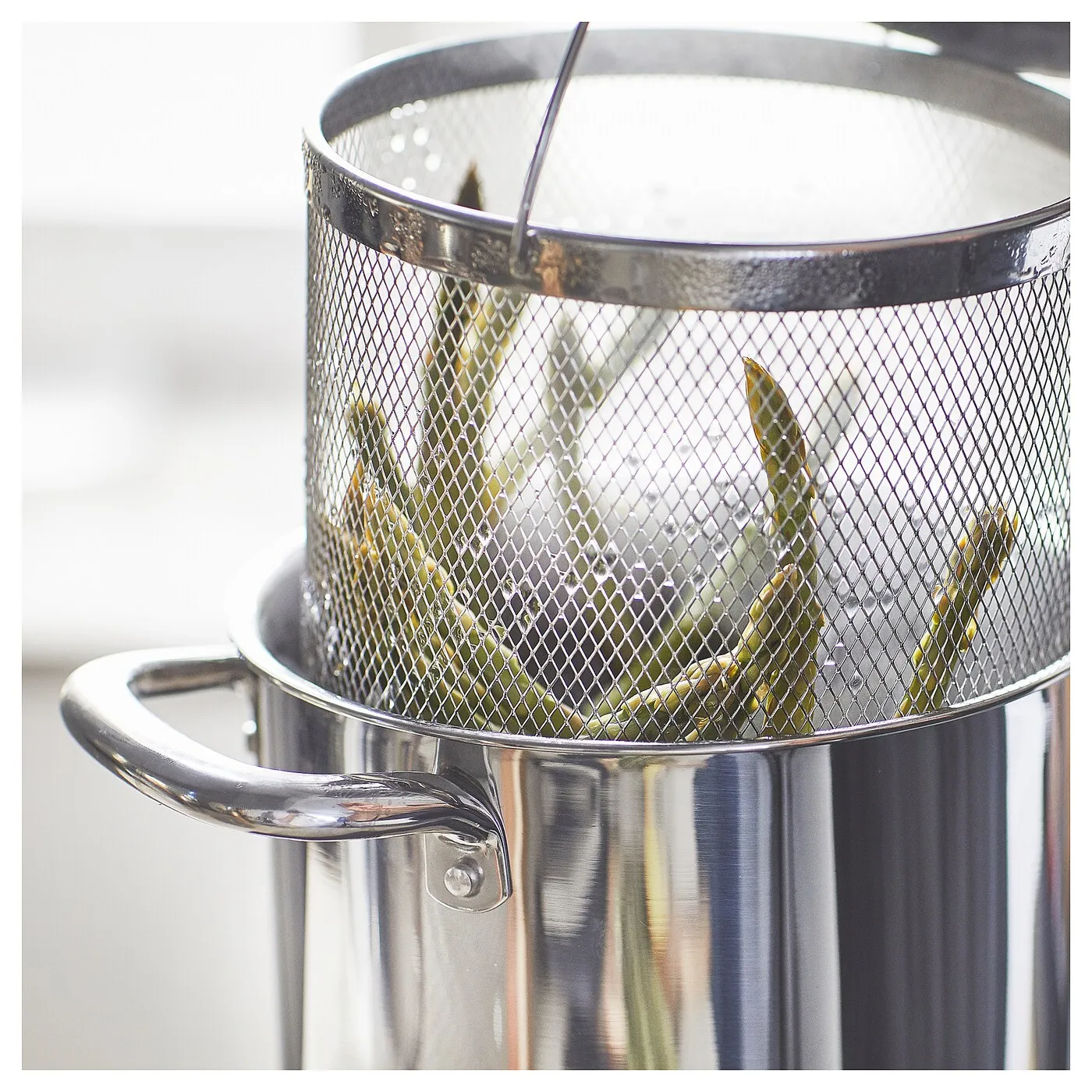 Эта кастрюля с вставкой — идеальный выбор для всего, от ароматной спаржи до пасты аль денте. Когда блюдо готово, просто поднимите вставку за ручку и быстро промойте приготовленное.