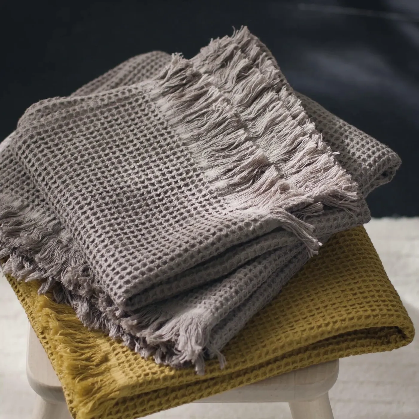 Сделано из хлопка и вискозы, это полотенце светло-серого и коричневого оттенков имеет вафельную текстуру, которая обеспечивает хорошее впитывание и быстрое высыхание. Кисточки по краям добавляют игривости.
