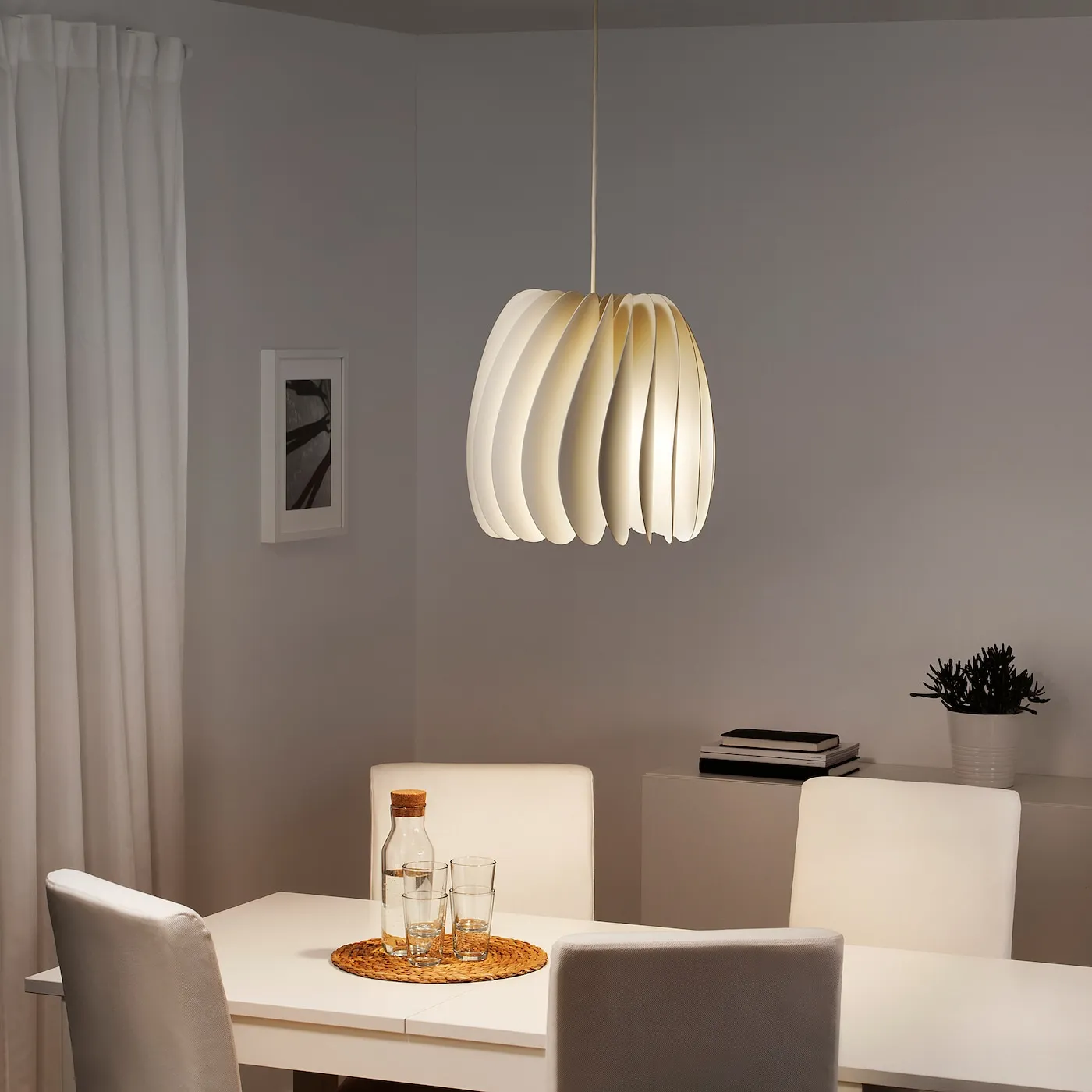 Подвесной светильник SKYMNINGEN отмечен наградой за дизайн и частично изготовлен из переработанного пластика. Изогнутая форма в виде турбины создаёт мягкое освещение и привлекает внимание в любом месте, где вы его повесите.