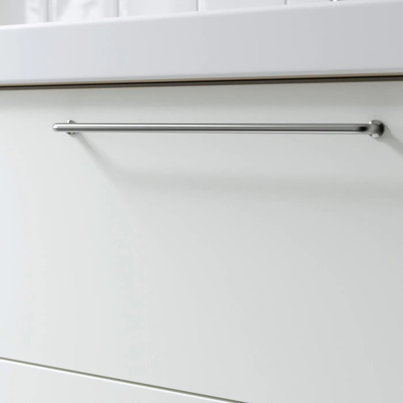 Что может не понравиться? Чистые прямые линии и матовое белое покрытие придают вашей ванной комнате свежий и привлекательный характер, который легко персонализировать, выбрав подходящие ручки или кнопки.