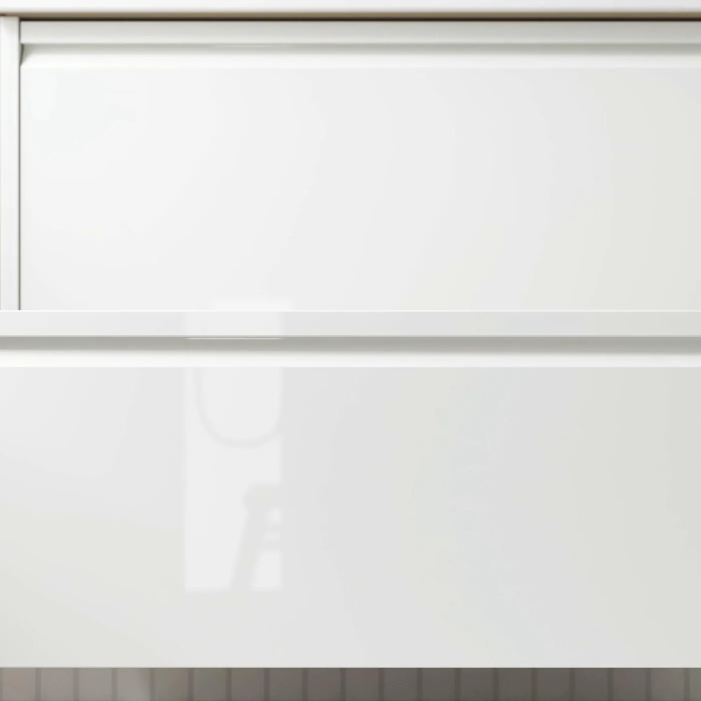 Белая глянцевая отделка создаёт стильный современный вид, подчеркнутый встроенными ручками.