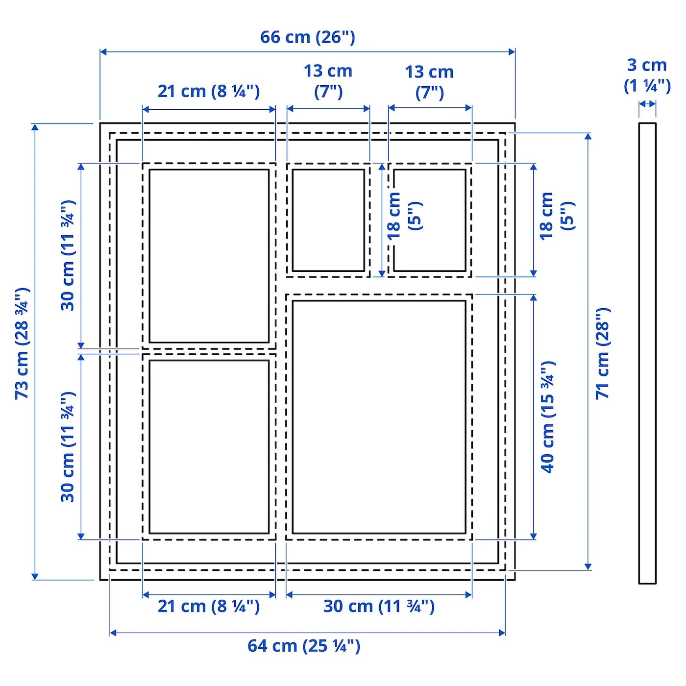 Вы можете использовать рамку для 2 фотографий размером 13x18 см, 2 фотографий 21x30 см и 1 фотографии 30x40 см или для одной фотографии размером 64x71 см.