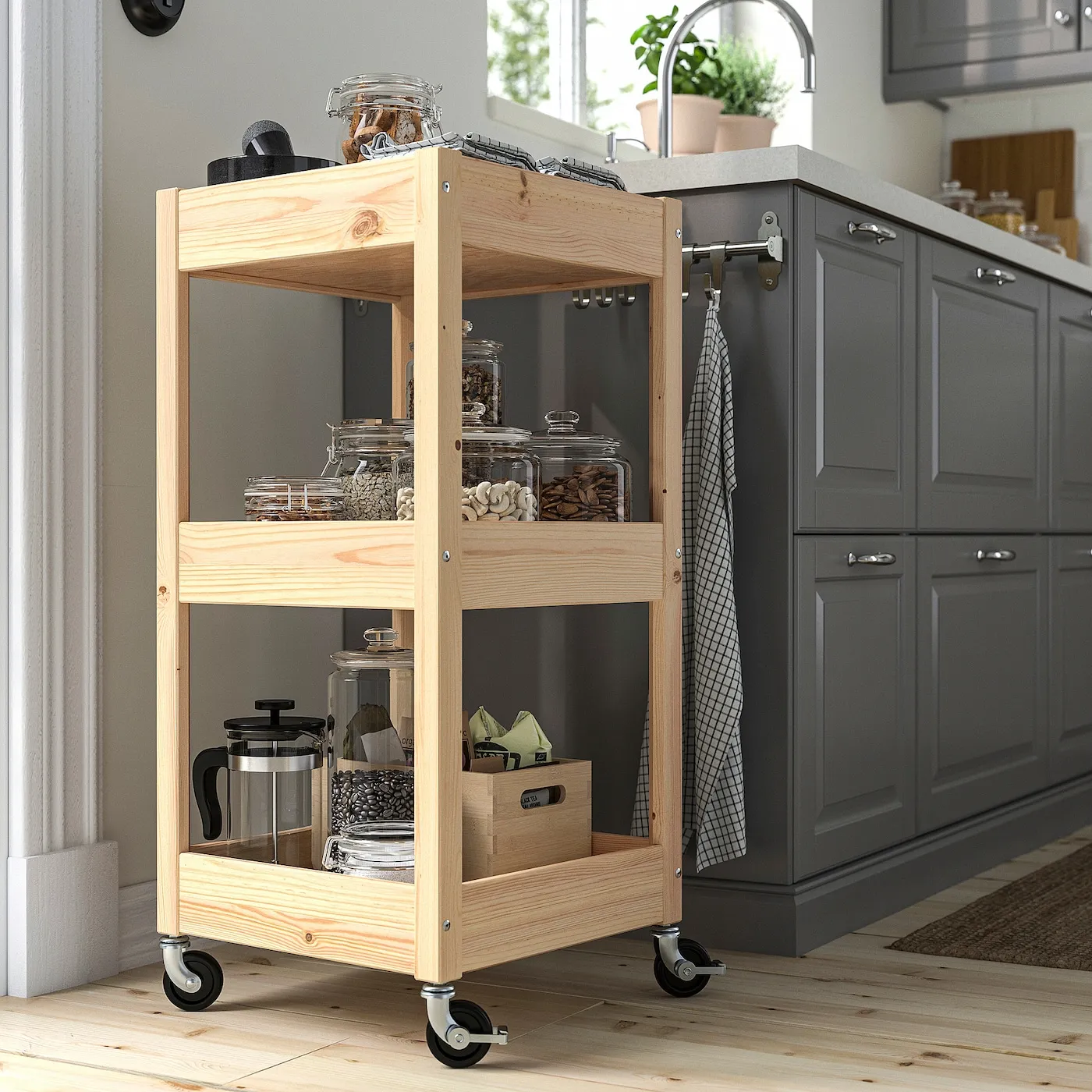 Небольшое дополнительное место для хранения никогда не помешает, особенно если оно удобно размещается по углам и перемещается туда, где нужно. Сосновая тележка LOSHULT всегда под рукой и добавляет комнате уютное тепло.