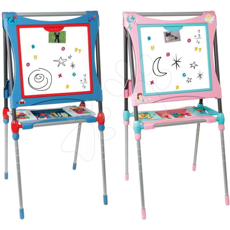 Двухсторонний мольберт на металлических ножках легко складывается и компактен в хранении. Белая металлическая сторона используется для рисования маркером или работы с магнитами, чёрная сторона – для мелков. Ножки мольберта не регулируются.