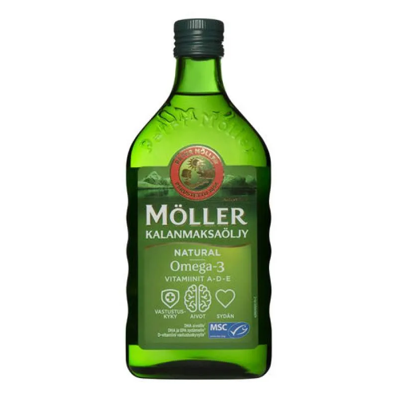 Mцller Kalanmaksaoljy 500мл получают из печени свежей арктической трески, в которой содержатся естественные Омега-3 жирные кислоты (DHA EPA), а также витамины А, D3 и E. Длинноцепочные Омега-3 жирные кислоты поддерживают здоровье сердца, сосудов и головного мозга. Витамин D3 оказывает положительно влияние на мышцы, кости и зубы. Витамин D3 также важен для сопротивления организма различного рода инфекциям. Витамин А способствует улучшению зрения. Витамин Е является антиоксидантом, который защищает мембраны клеток организма от окисления.