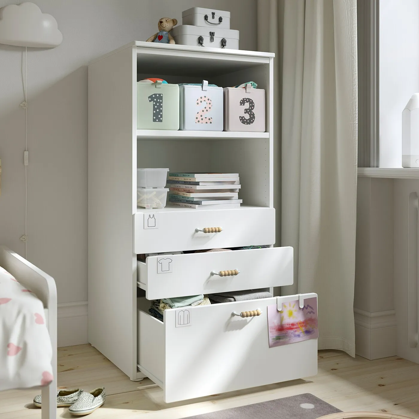 Этот книжный шкаф обеспечивает много места для хранения в компактной форме — от детства до подросткового возраста. На открытых полках удобно размещать вещи, чтобы они всегда были под рукой, а в ящиках найдется место для предметов любого размера.