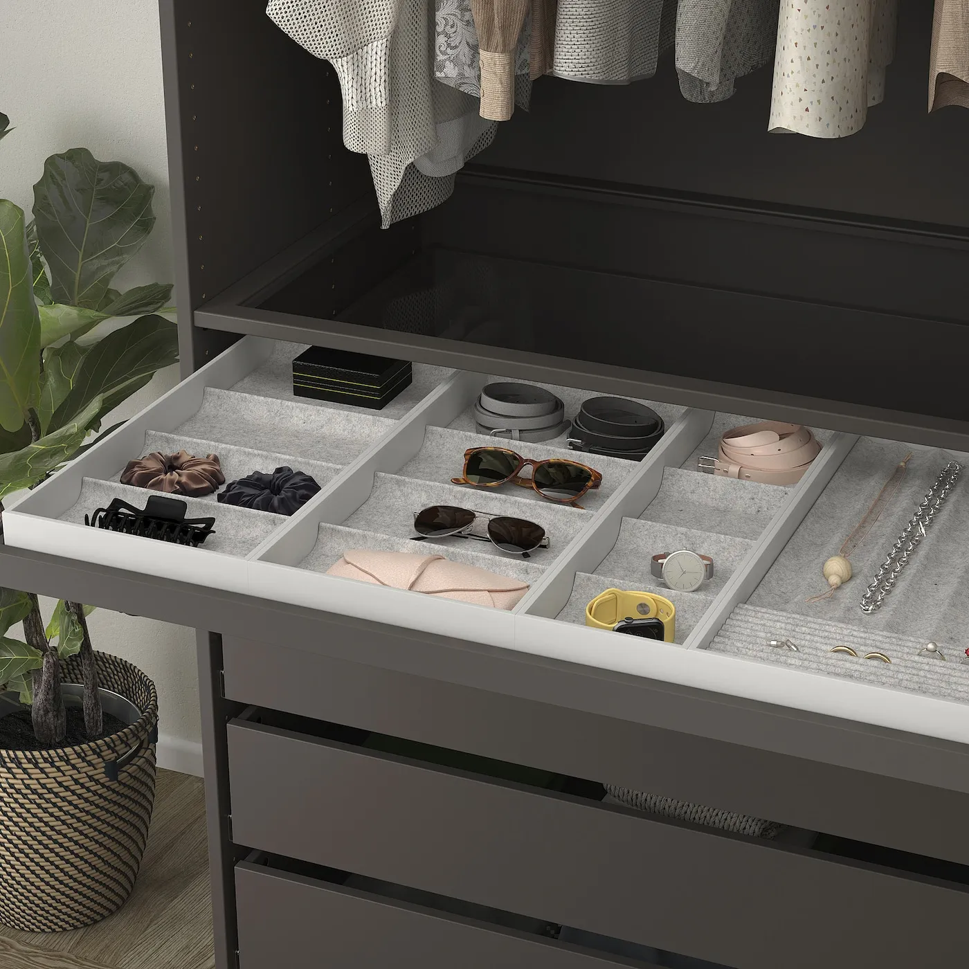Может быть дополнено стеклянной полкой KOMPLEMENT, чтобы содержимое лотка было видно сверху.