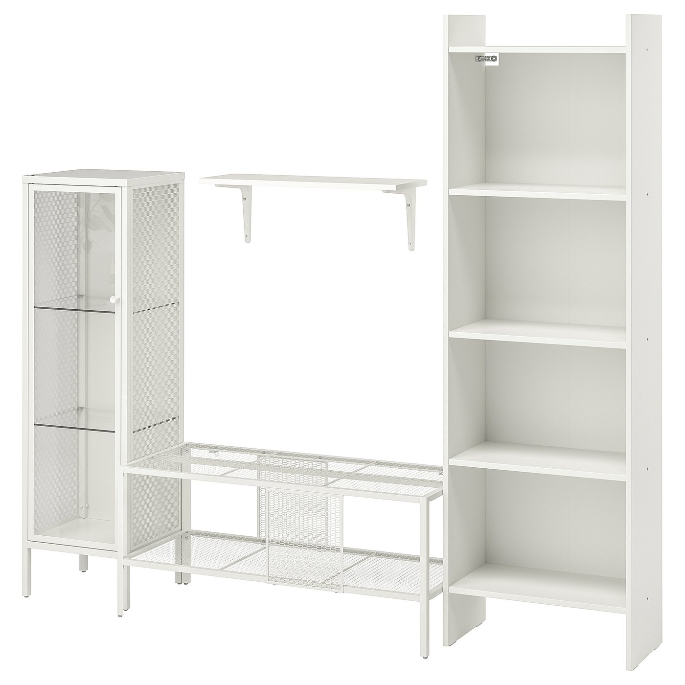 Мы упростили задачу, предложив готовое решение из сетки, стекла и дерева. Оно включает книжный шкаф, витрину, стойку для ТВ и полку на стену — простой и чистый дизайн позволяет легко разместить его.