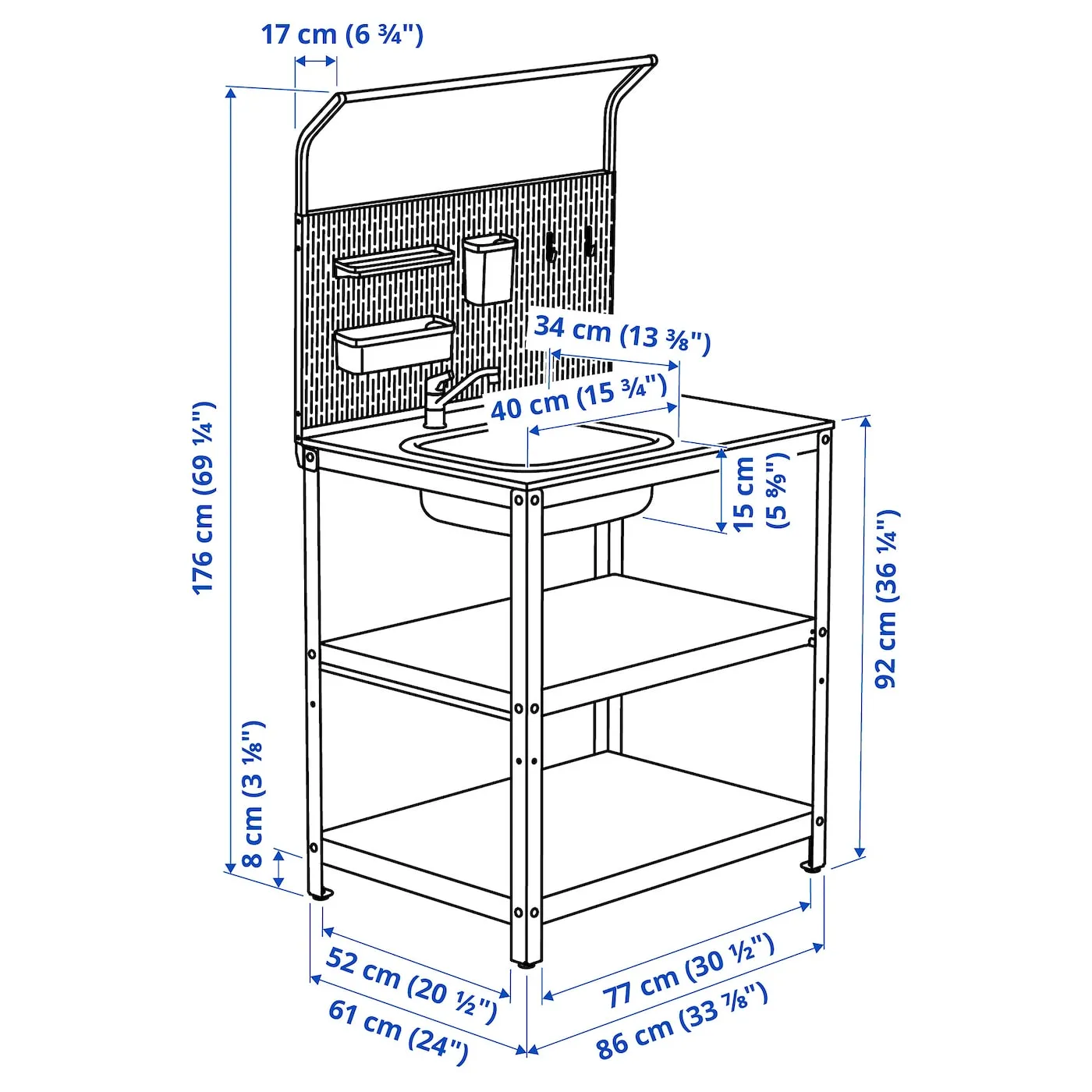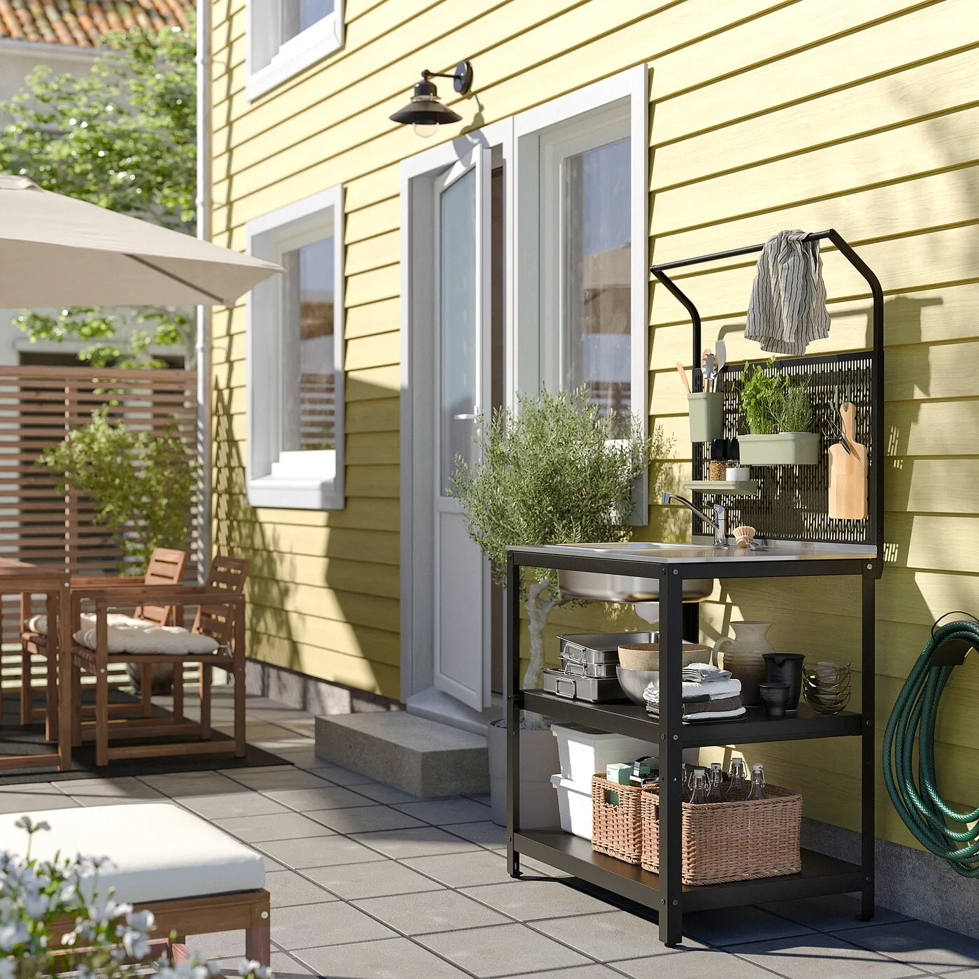 Уличная мойка с полками для хранения и практичной рабочей зоной с раковиной, где можно спрятать грязную посуду во время барбекю. Удобно, как и на вашей кухне!