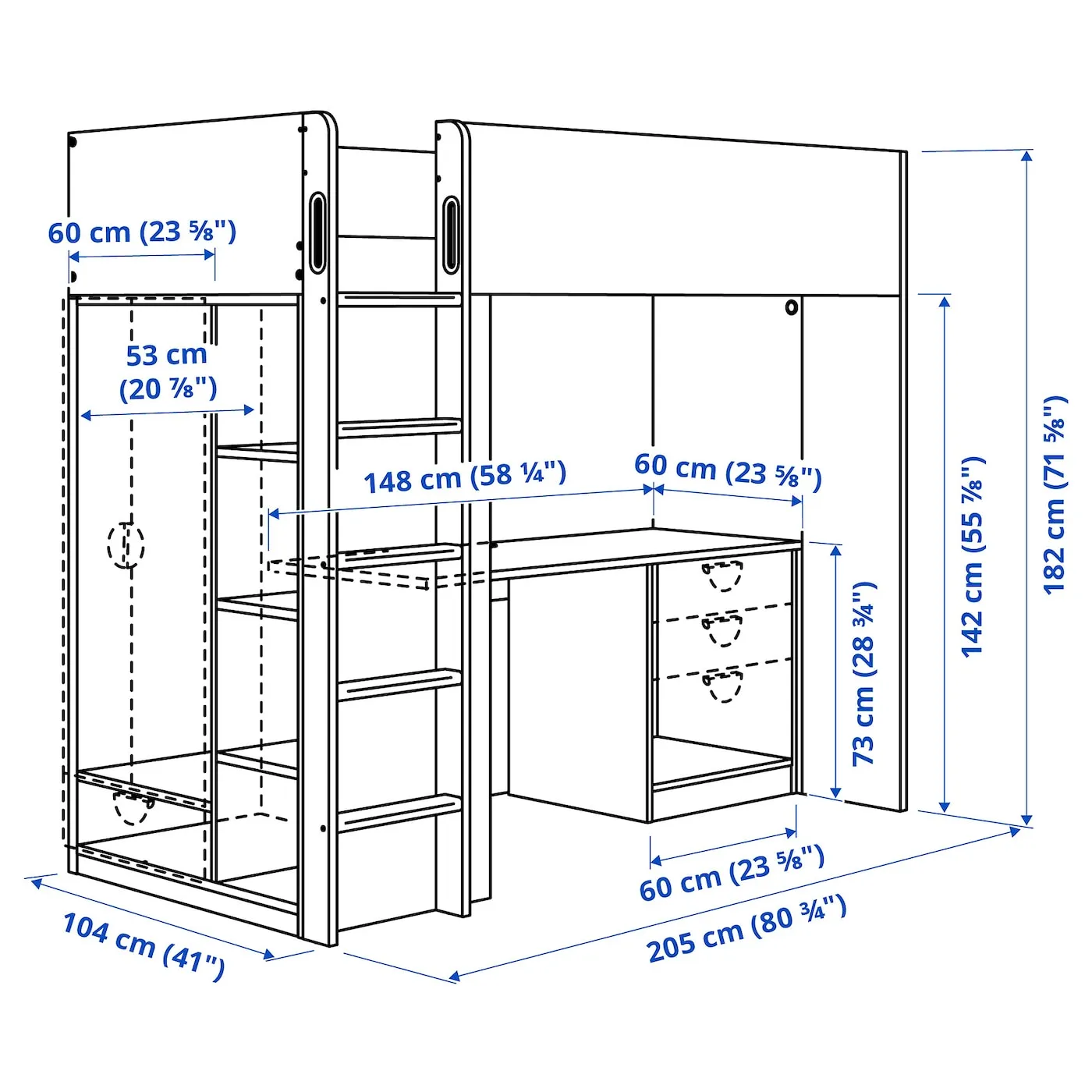 С этой чердачной кроватью ваш ребенок получает полноценное решение для своей комнаты – с письменным столом, шкафом и открытой полкой.