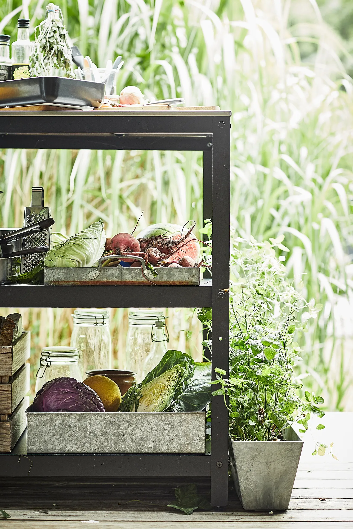 На полках достаточно места для тарелок, стаканов, приборов и всего необходимого для барбекю-вечеринки.