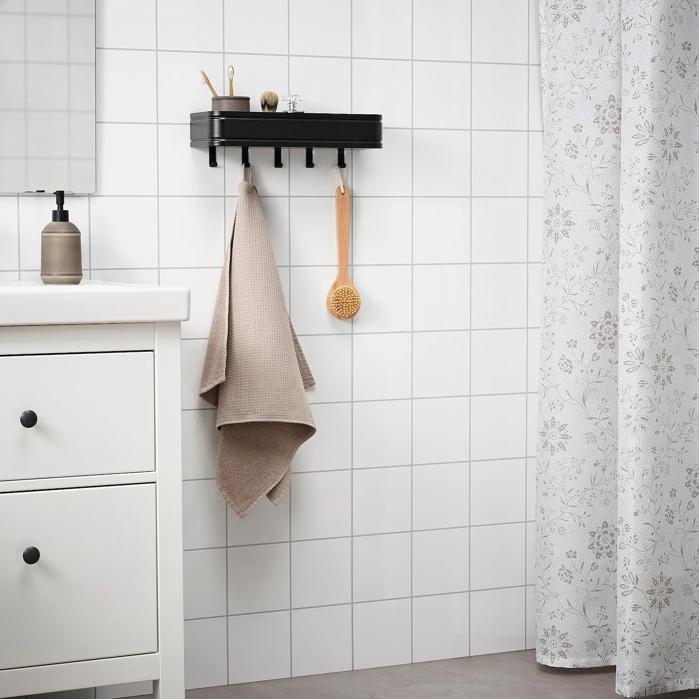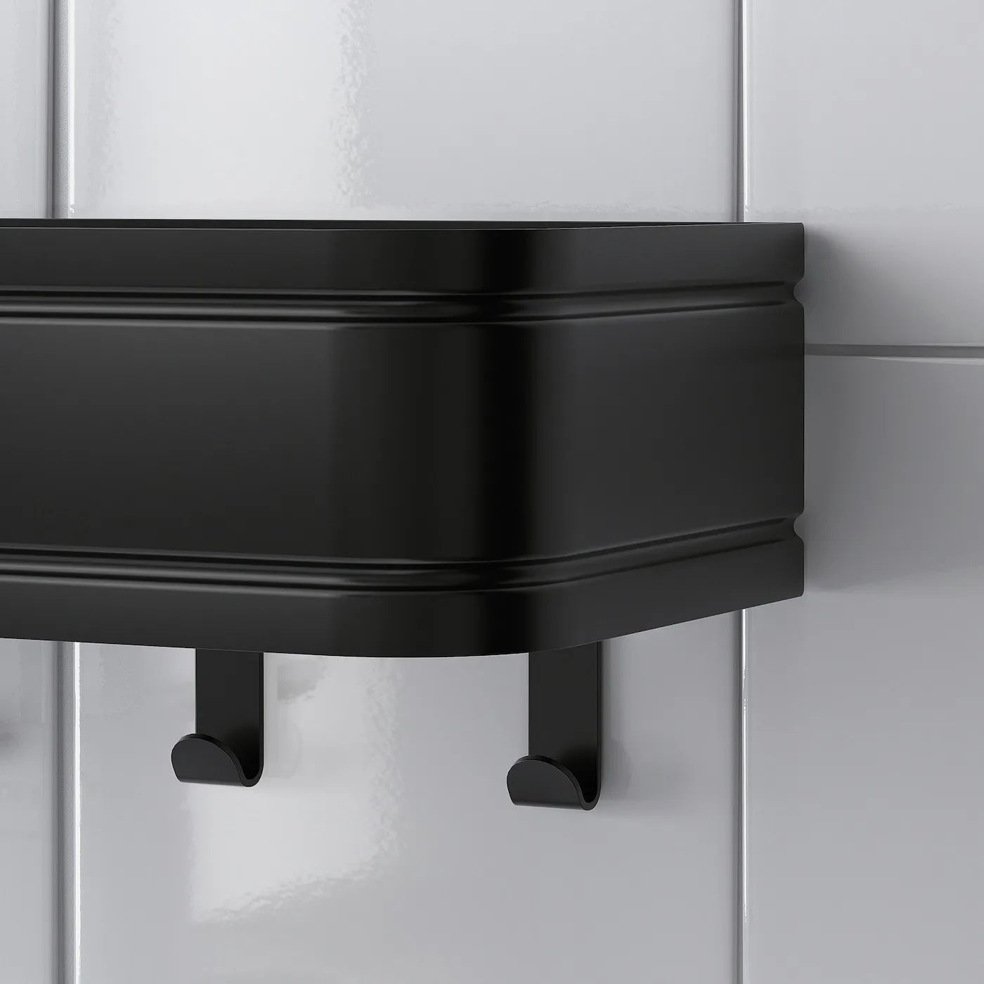 Это хранилище с полкой и крючками из черного металла оснащено бортиками, которые удерживают вещи на месте. Дизайн прекрасно сочетается с другими аксессуарами для ванной из серии LILLASJÖN.