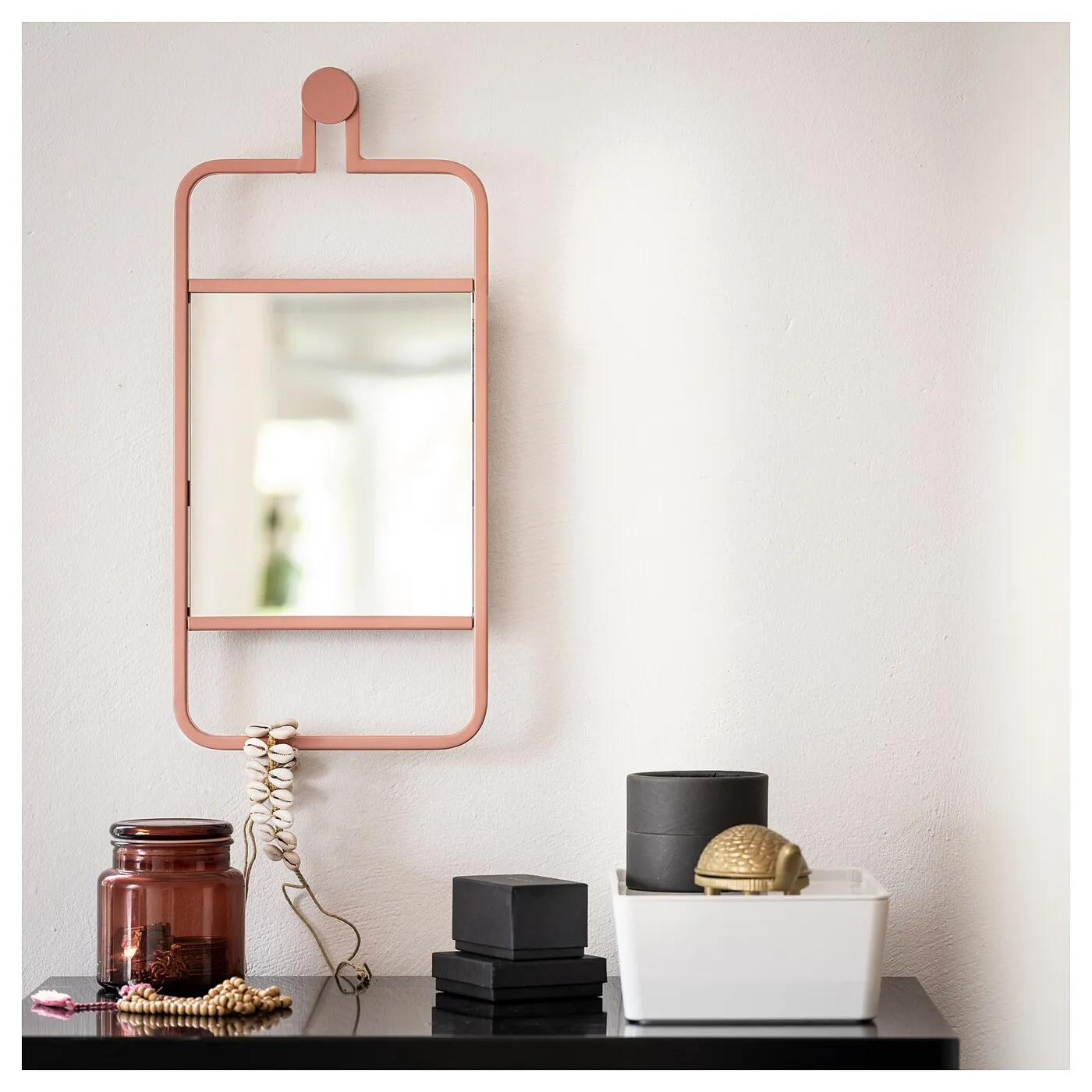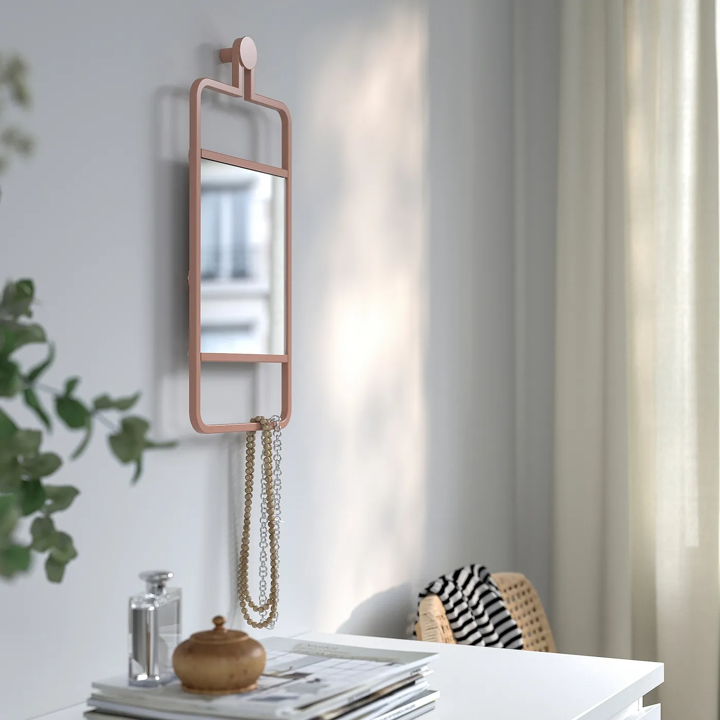 Добавив это декоративное и функциональное зеркало в интерьер, вы добавляете глубину, благодаря чему помещение кажется больше и светлее, а также получаете удобное место для хранения аксессуаров.