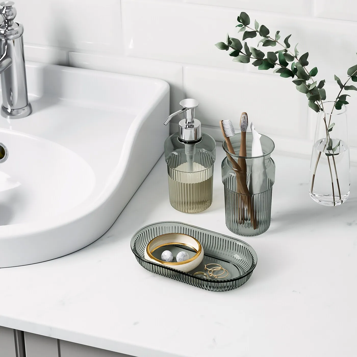 Состоит из: 1 дозатора для мыла объемом 33 cl (диаметр 7 см, высота 17 см), 1 держатель для зубных щеток (диаметр 7 см, высота 13 см) и 1 поднос (длина 18 см, глубина 10 см).
