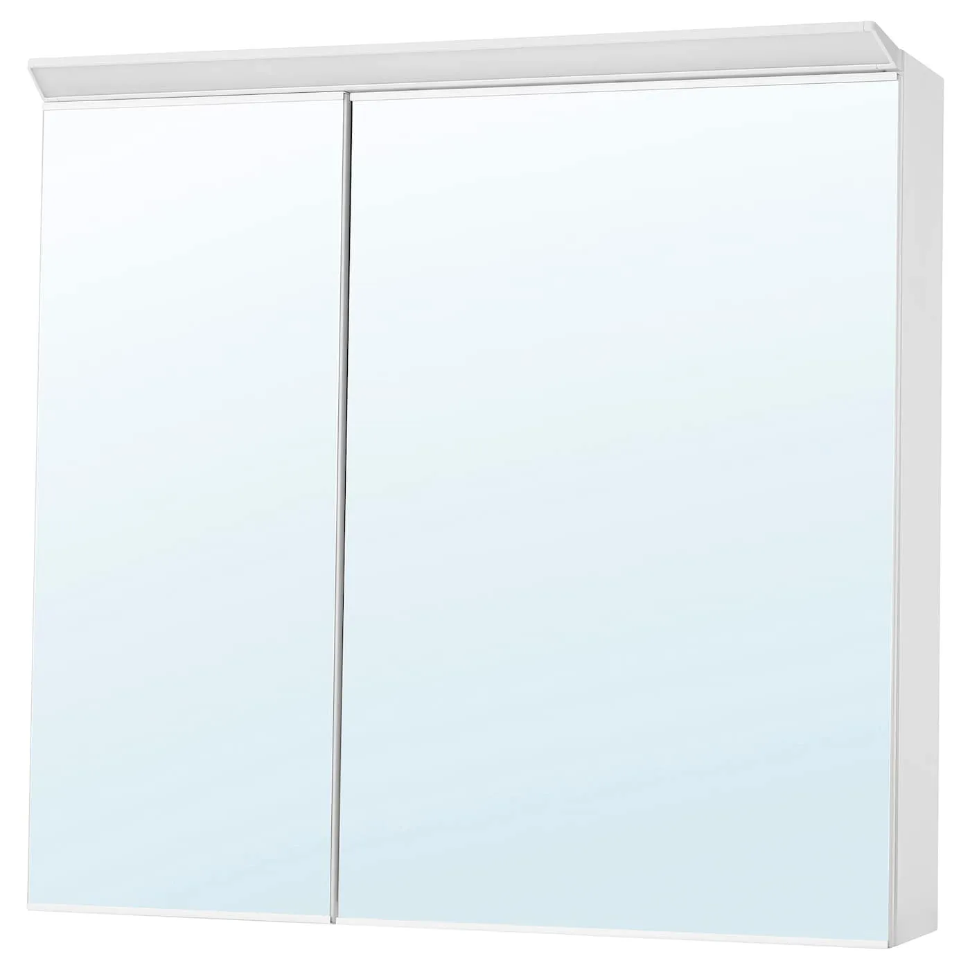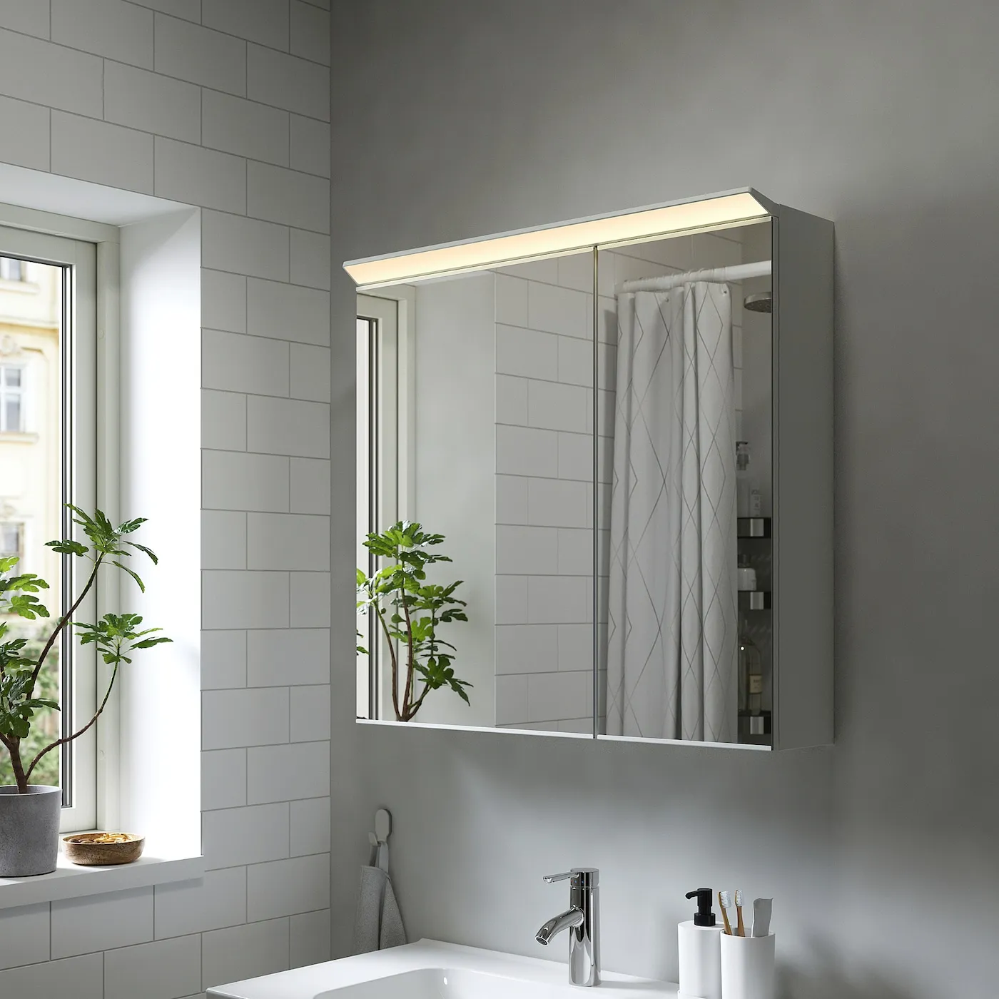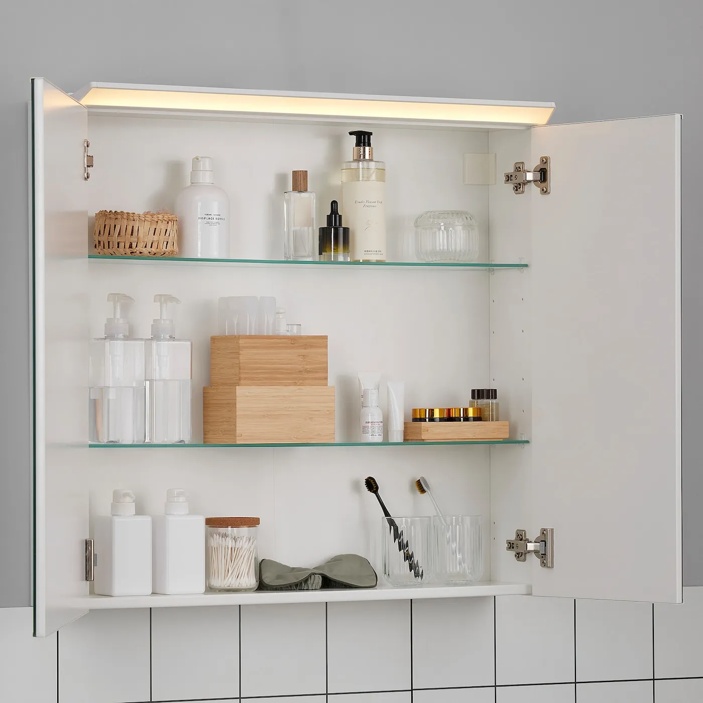 Шкаф-зеркало, который рационально использует пространство на стене и дополнен светодиодным освещением, создающим рассеянный свет в ванной, чтобы ваш день начинался и заканчивался приятно.