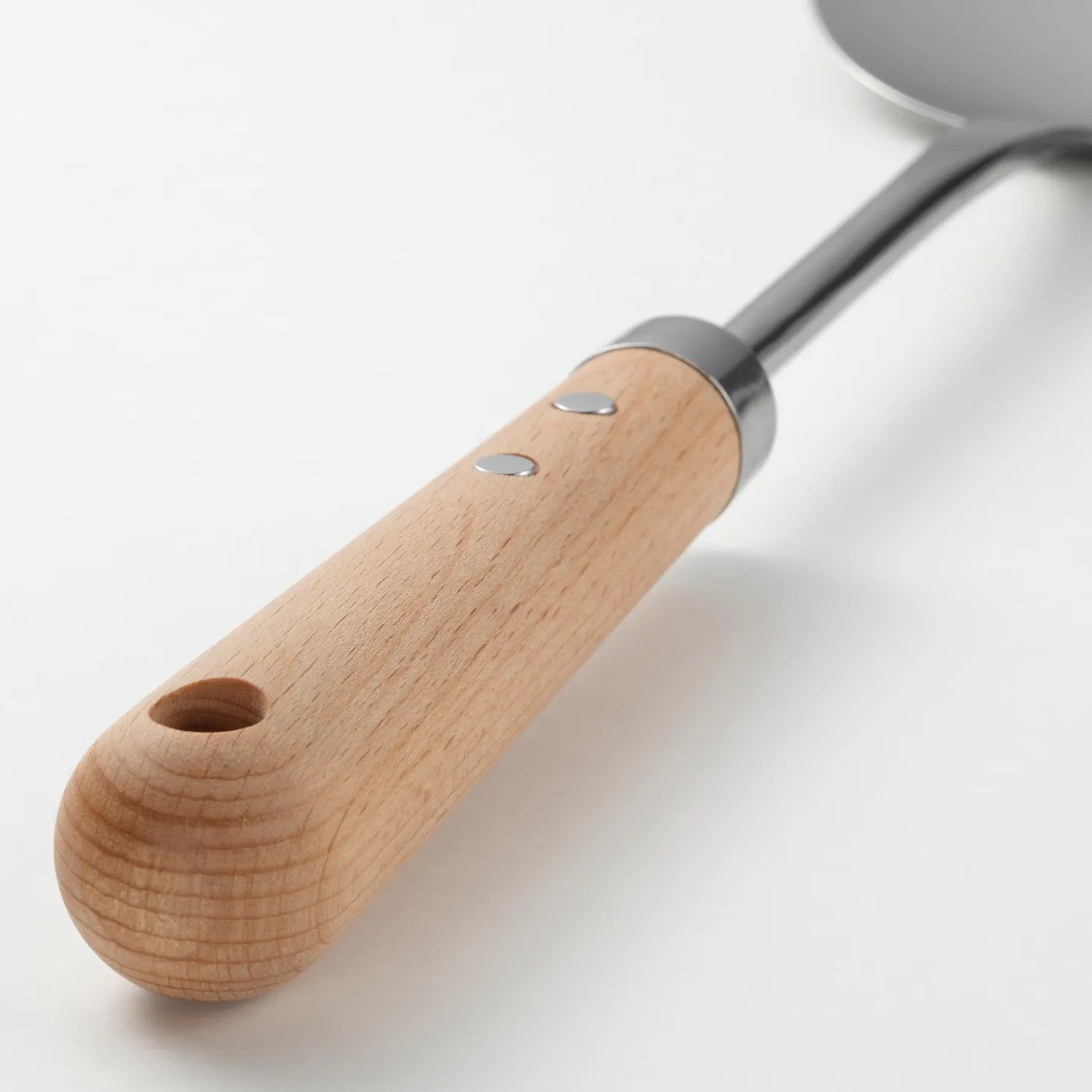Ручка из светлого дерева удобно лежит в руке и придает кухонному инструменту естественный и прочный вид.