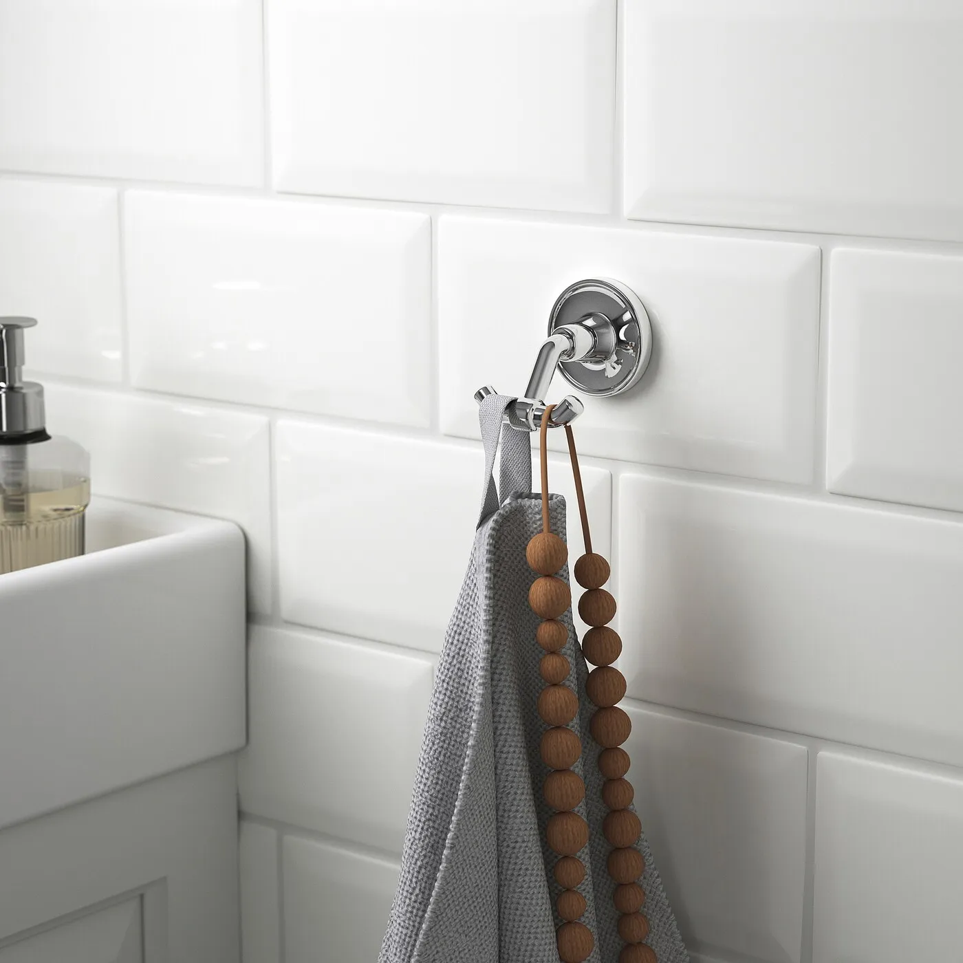 Аксессуары для ванной комнаты BROFJÄRDEN с блестящими хромированными деталями напоминают элегантные, неподвластные времени дизайнерские решения прошлого. Этот двойной крючок помогает держать в порядке полотенца, щетки и губки для душа.