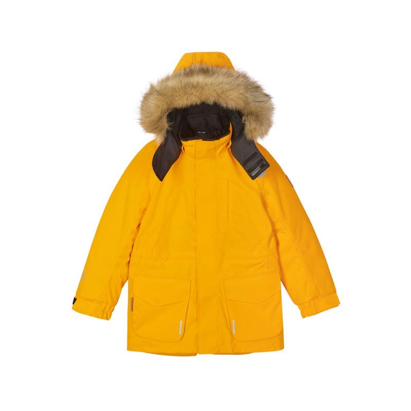 Модель удлинённая, с гладкой подкладкой из переработанных волокон. Капюшон съёмный и регулируемый, с отстёгивающейся искусственной меховой опушкой. Регулировка по талии и манжетам обеспечивает отличную посадку. Начиная с размера 116, предусмотрен внутренний карман на молнии, а два внешних накладных кармана удобны для хранения мелочей.
