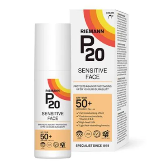 Солнцезащитный крем P20 Sensitive Face SPF 50+ содержит солнцезащитный спектр, предназначенный для защиты кожи лица и шеи от признаков старения, вызванных светом.