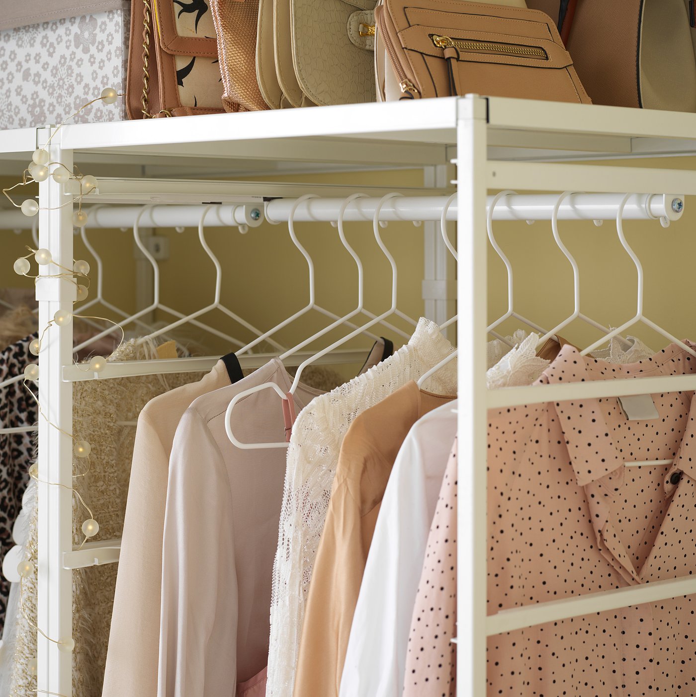В этой комбинации гардероба достаточно места, чтобы повесить рубашки, сложить свитера и разместить обувь и сумки.