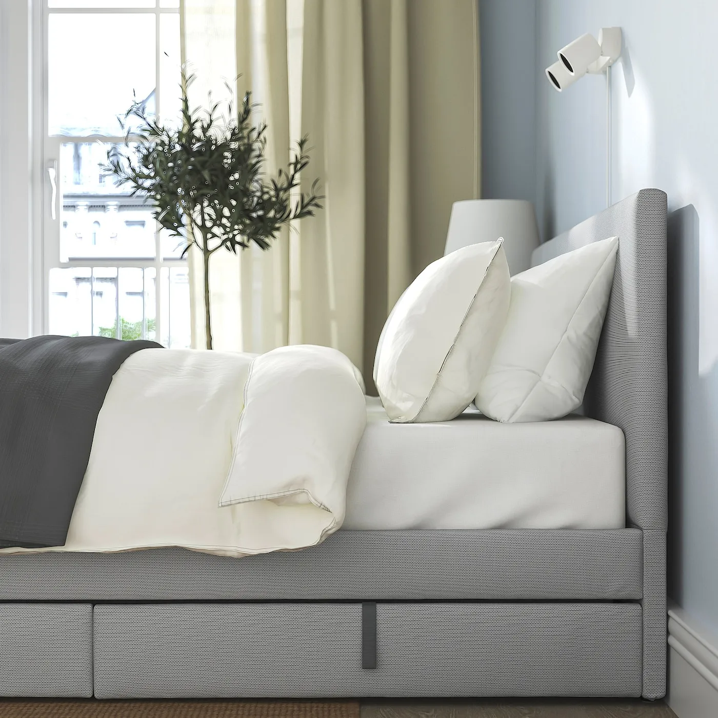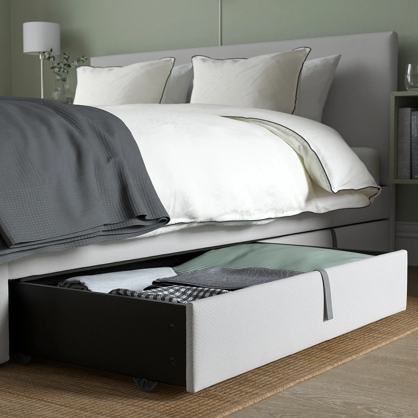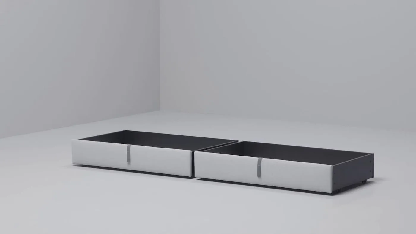 Ящики для хранения имеют такую же обивку серого цвета KABUSA, как и каркас кровати, и идеально подходят по размеру.