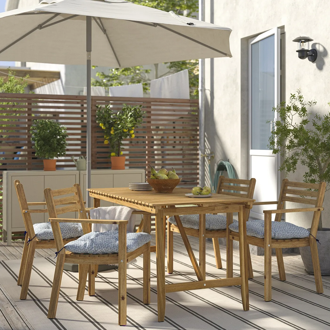 Изготовленный из прочной, экологически ответственно добытой акации, обеденный комплект ASKHOLMEN с дополнительно удобными подушками позволяет наслаждаться трапезами в небольших открытых пространствах. Комбинируйте с другими элементами серии, чтобы создать зеленый оазис.