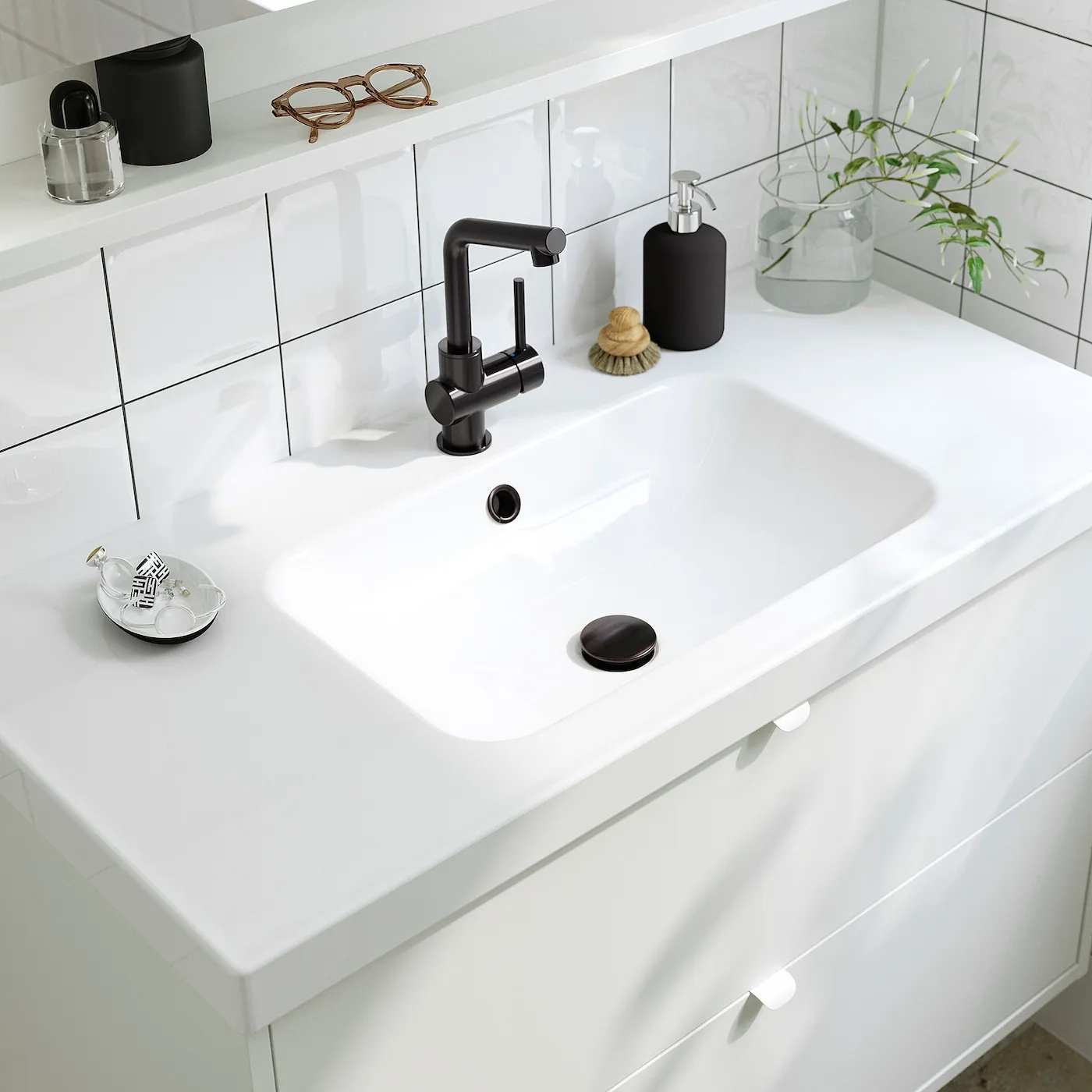 Мебель для ванной комнаты TÄNNFORSEN сочетает в себе классическое изящество и изготовление с косыми краями, что придает ей особый шарм. Этот комплект включает 2 просторных ящика и место на раковине для зубных щеток и мыла.
