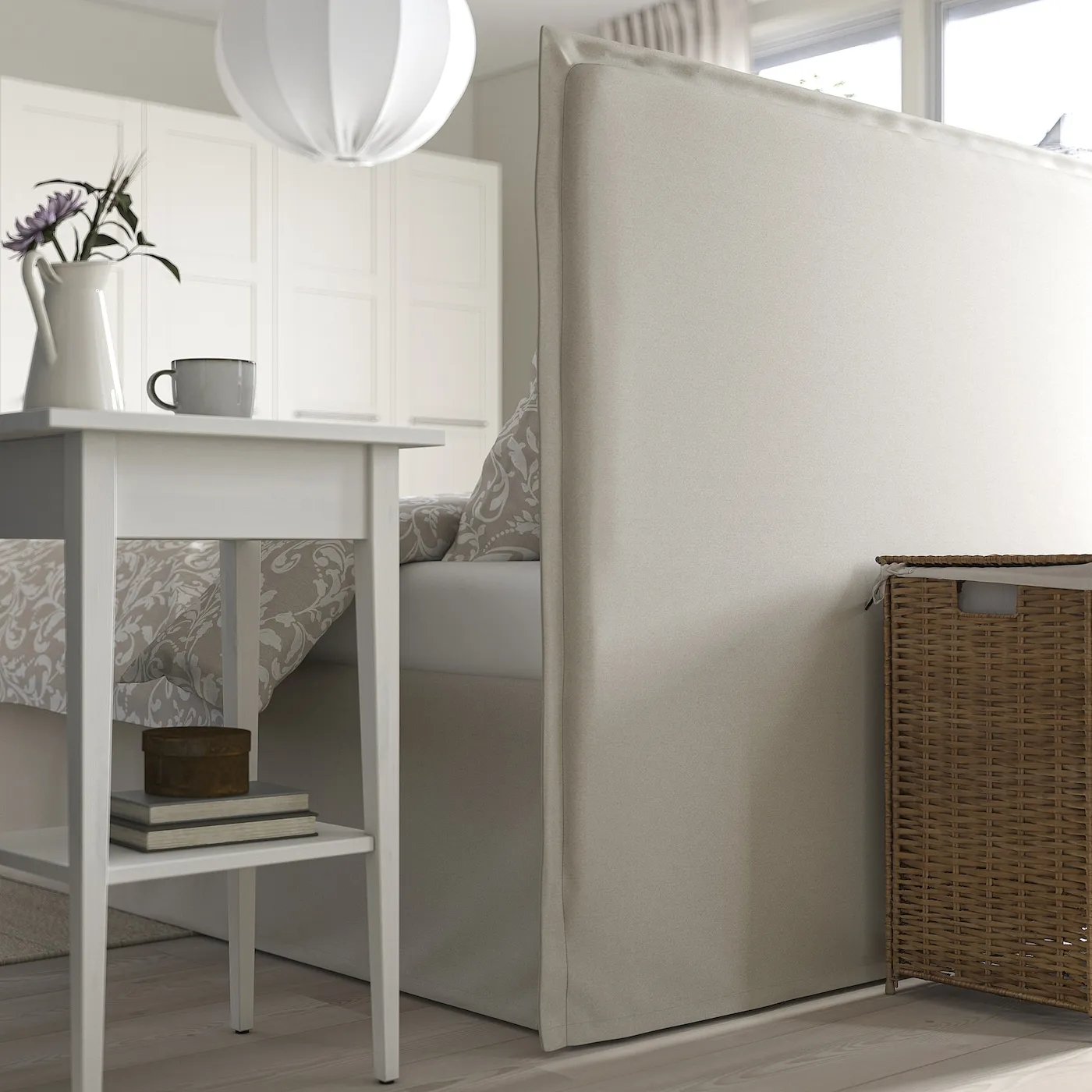 Юбка на кровати дополняет дизайн и скрывает вещи, которые хранятся под кроватью — отличное место для хранения коробок или громоздких предметов.