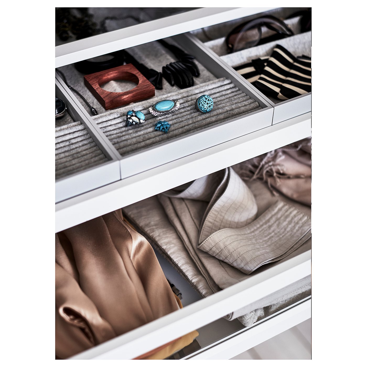 Ящики с стеклянной передней панелью дают прекрасный обзор содержимого, в то время как обычные ящики позволяют скрывать другие вещи.