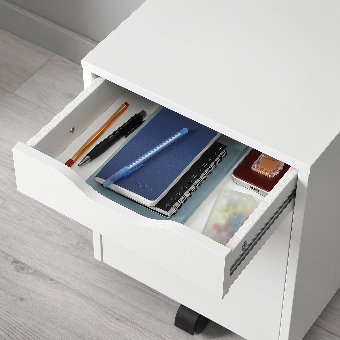 Верхний ящик можно использовать для хранения ручек и других мелочей, а нижний — для более крупных предметов.
