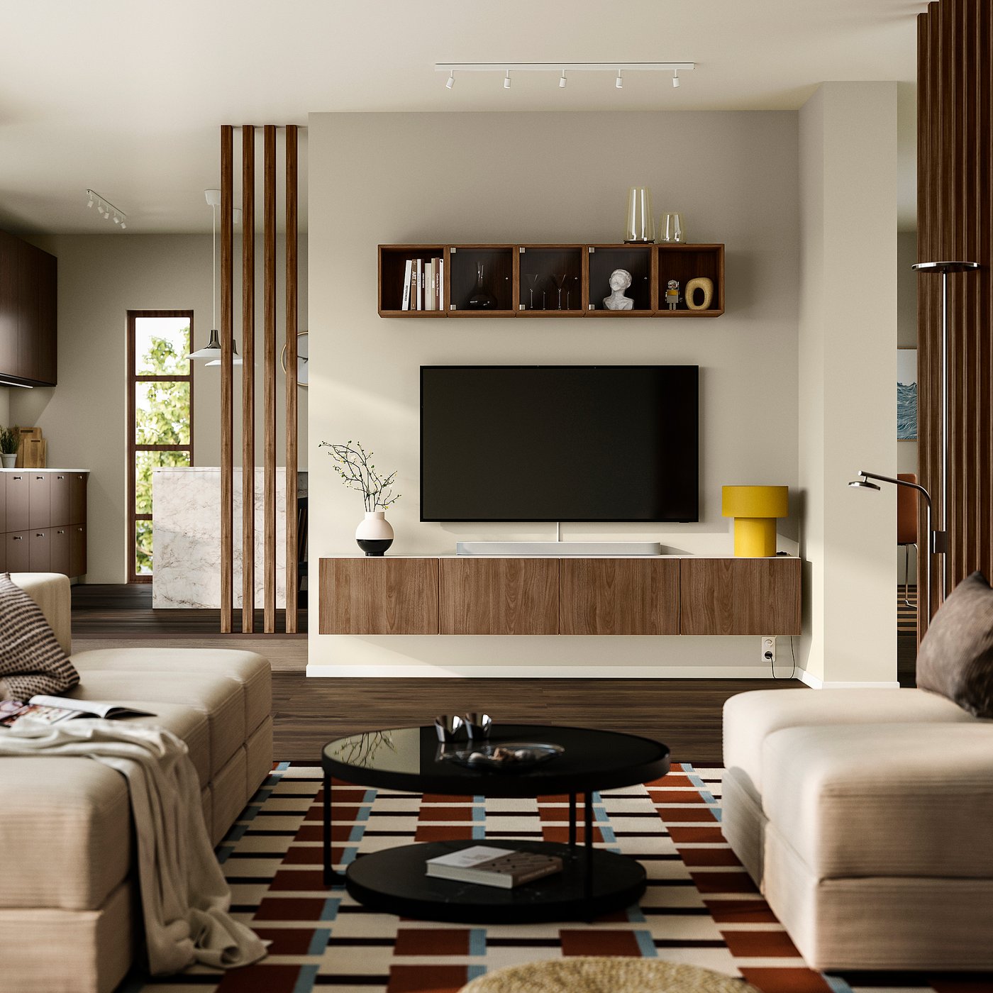 Много места для хранения и удобное управление кабелями. Эта настенная ТВ-тумба объединяет 3 каркаса в стильное и функциональное решение. Большая ширина делает её идеальной для крупного телевизора!