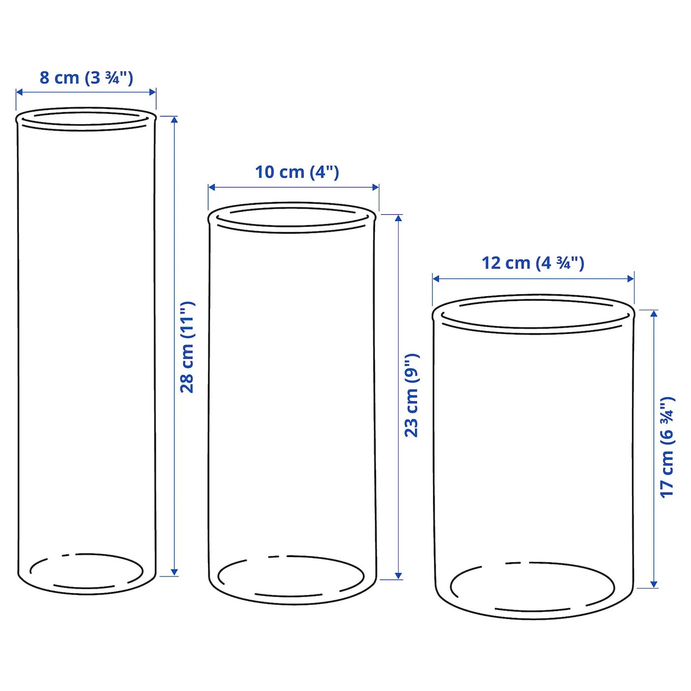 Состав набора: 1 ваза (высота 28 см, диаметр 8 см), 1 ваза (высота 23 см, диаметр 10 см) и 1 ваза (высота 17 см, диаметр 12 см).