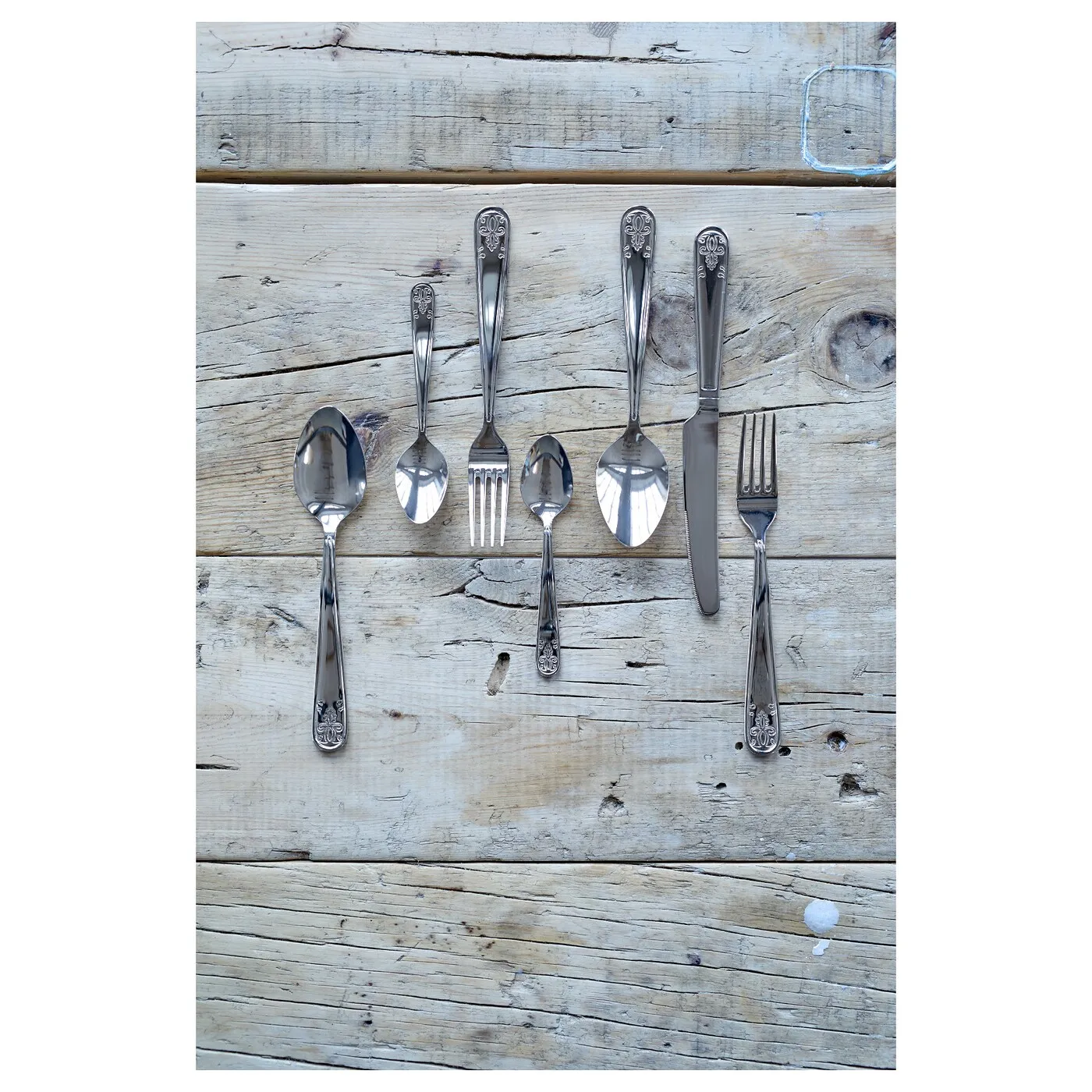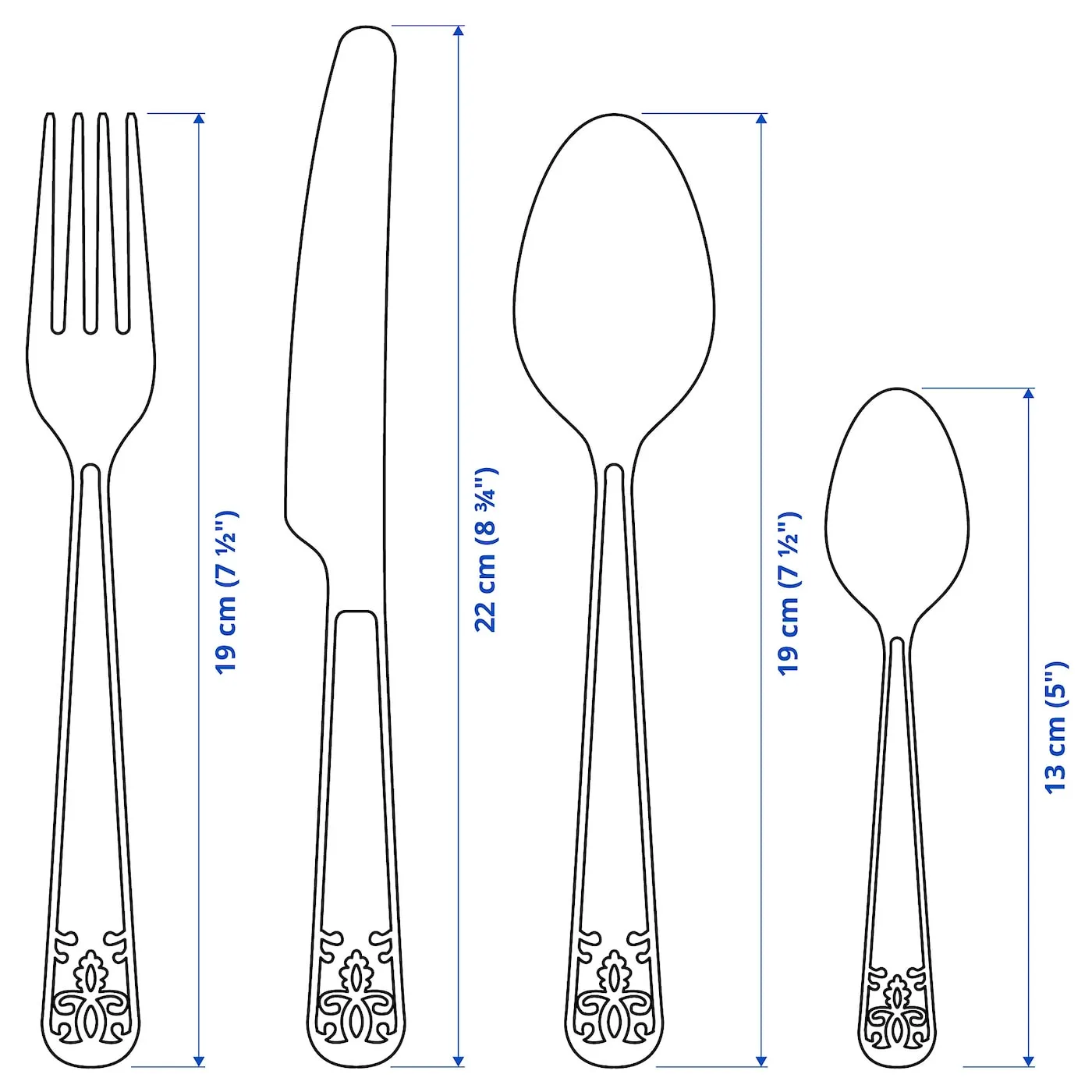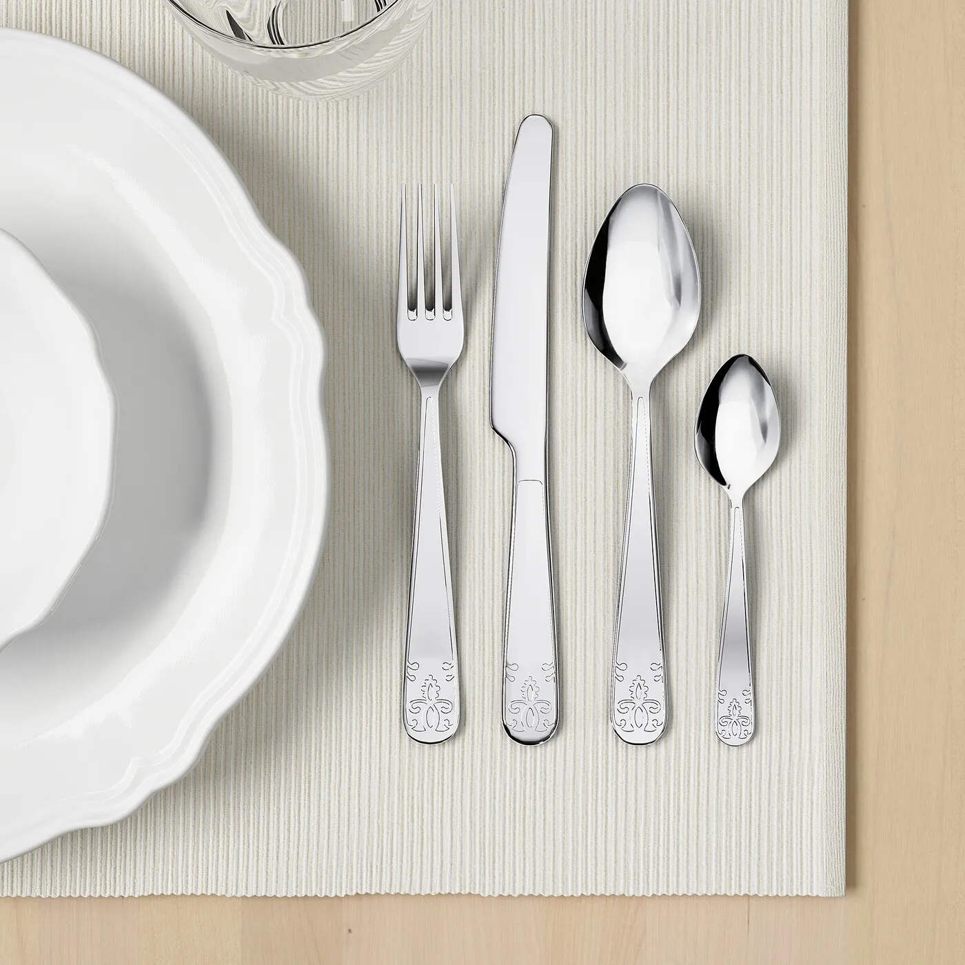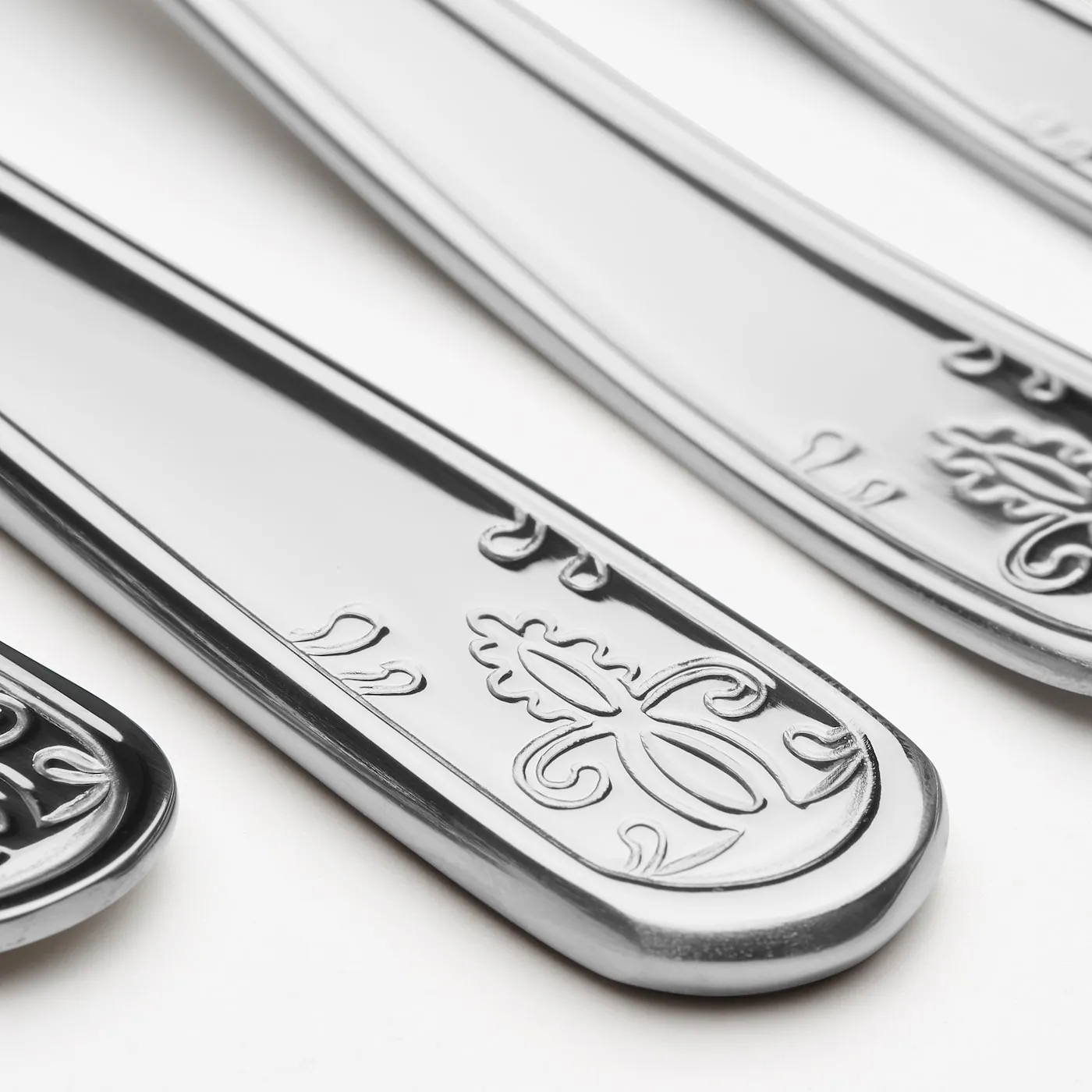 Состав: вилка, нож, ложка и чайная ложка, по 6 штук каждого типа.