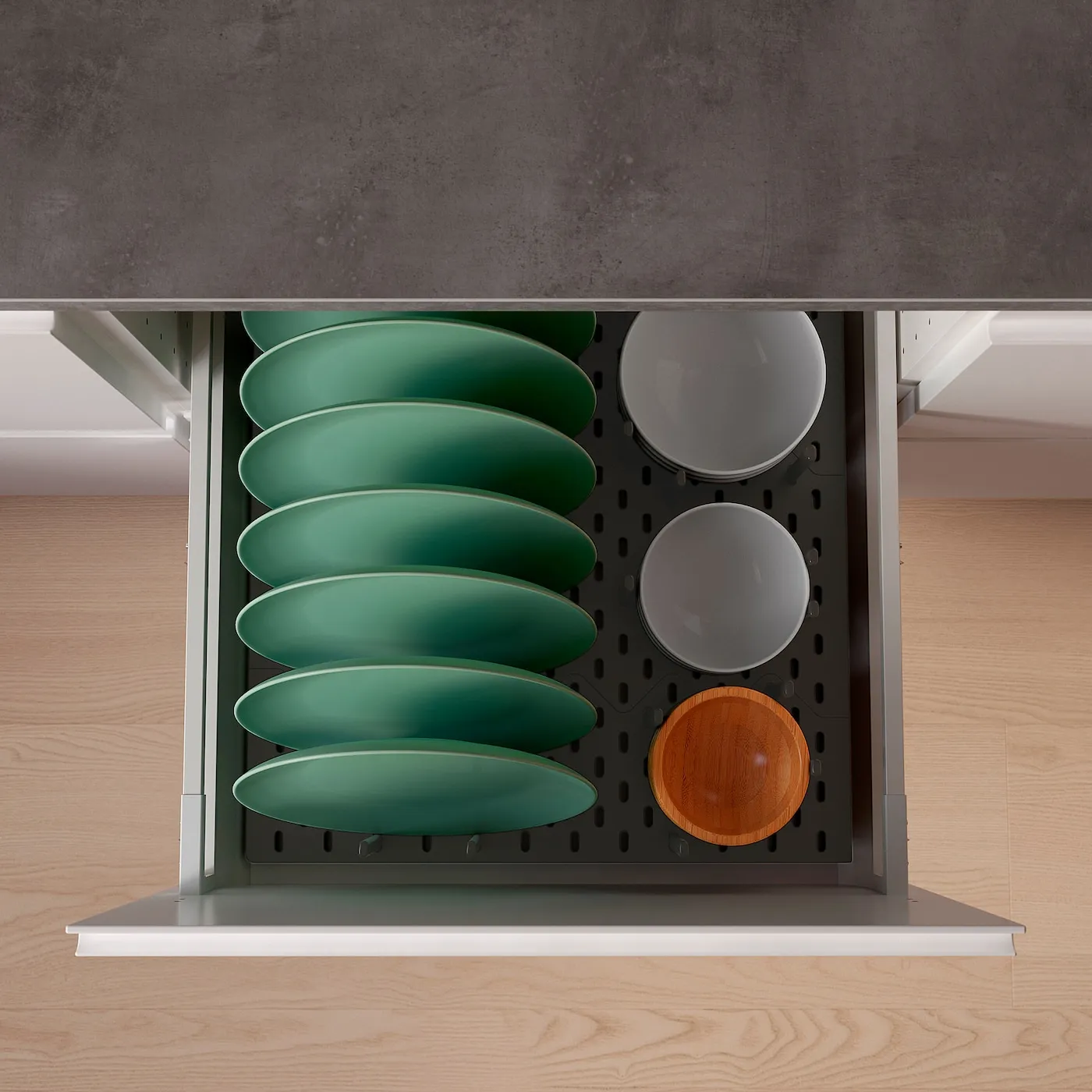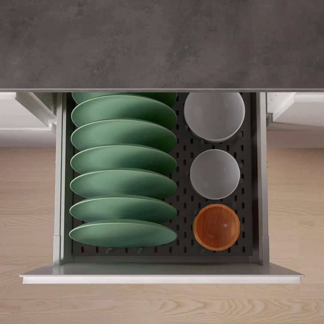 24 регулируемых штифта позволяют легко настроить ящики в зависимости от их содержимого, будь то тарелки, кастрюли, крышки или контейнеры для еды.