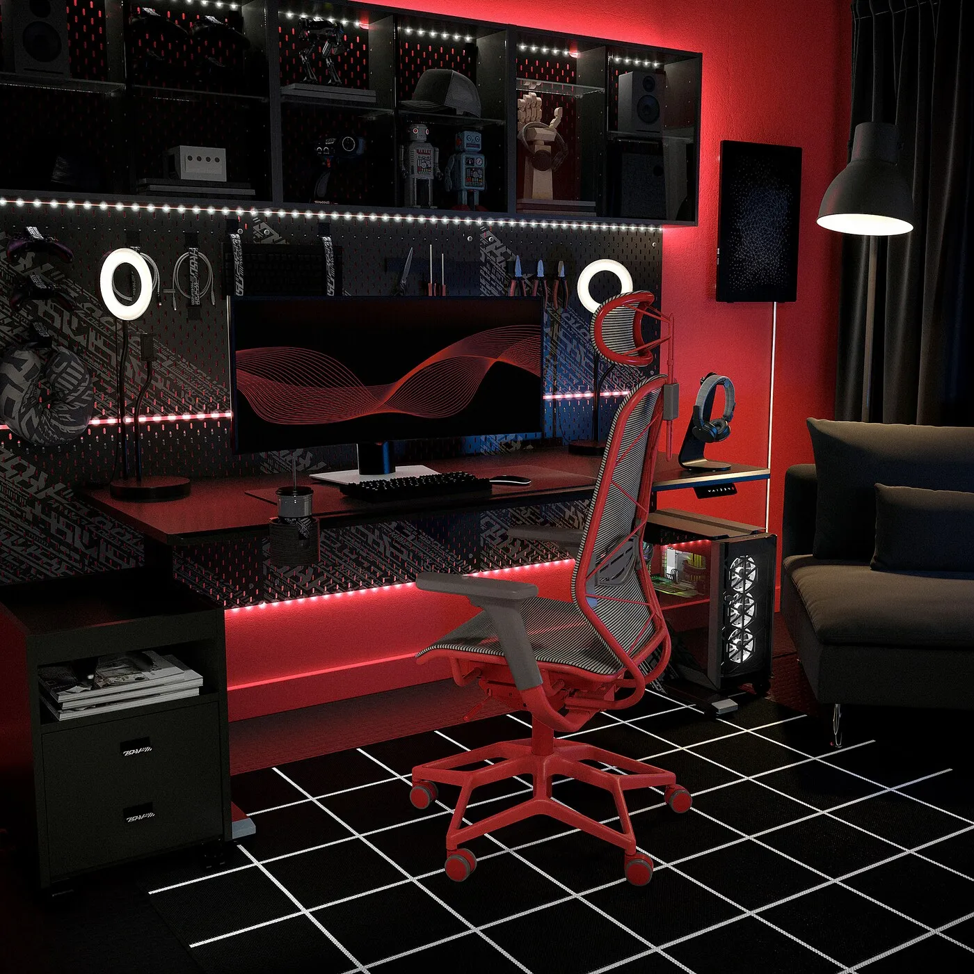 Игровое кресло STYRSPEL поможет вам достичь новых высот в игре. Настраивайте подголовник, поясничную поддержку, подлокотники, а также высоту и глубину сиденья — сетчатый материал обеспечит комфорт, когда игра накаляется!