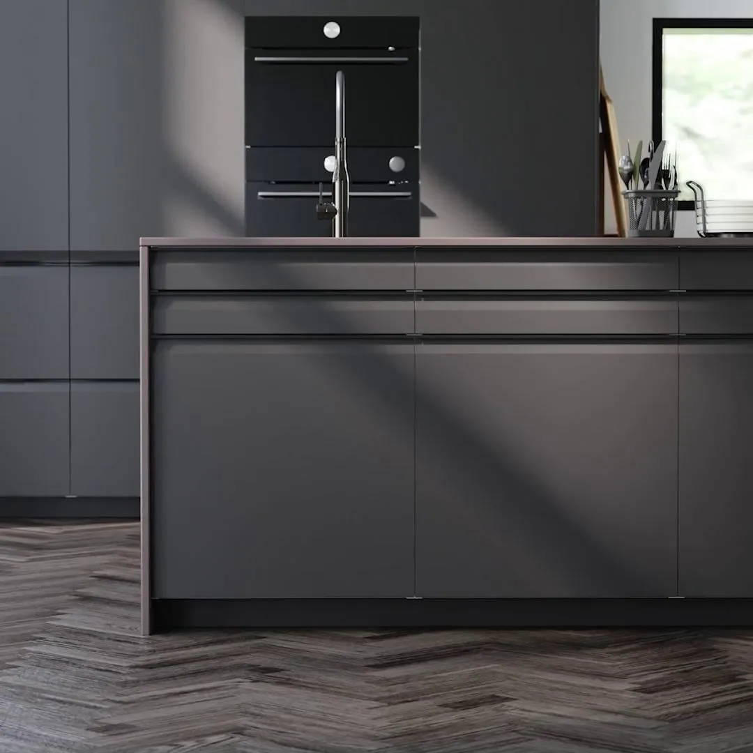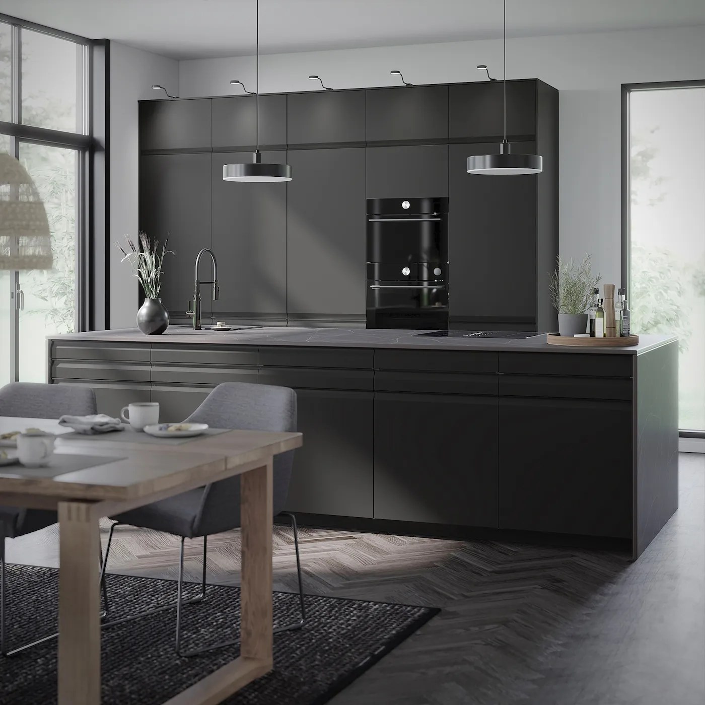 Фронты кухни UPPLÖV в матовом черном оформлении предлагают современный и утонченный вид с фасками и встроенными ручками того же оттенка. Элегантные и графичные детали, которые создают стильный облик на всем протяжении.