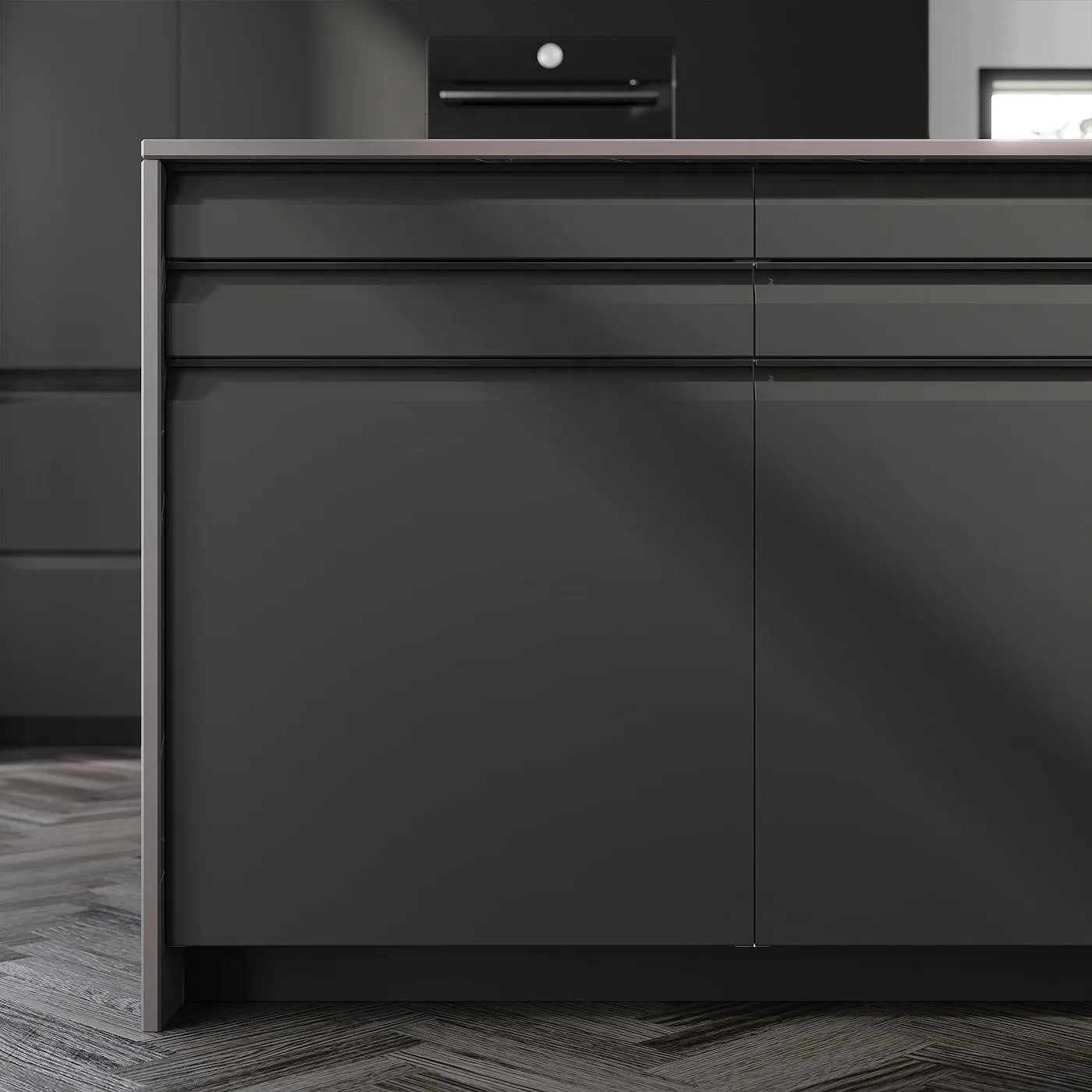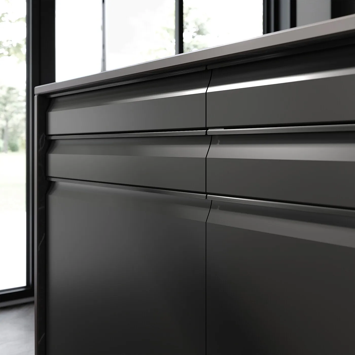 Встроенная алюминиевая ручка черного цвета гармонично сочетается с фасадом, создавая современный и графичный облик. Она также обеспечивает стабильность и естественный удобный захват.