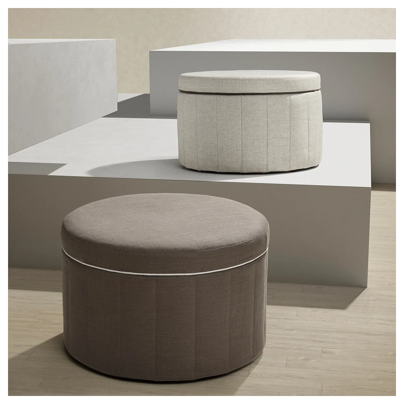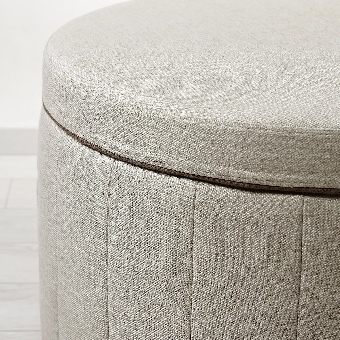 Большой круглый пуф в классическом стиле, который станет украшением вашего дома. За элегантными складками по бокам и декоративной окантовкой крышки скрывается просторное место для хранения с вместительными карманами.