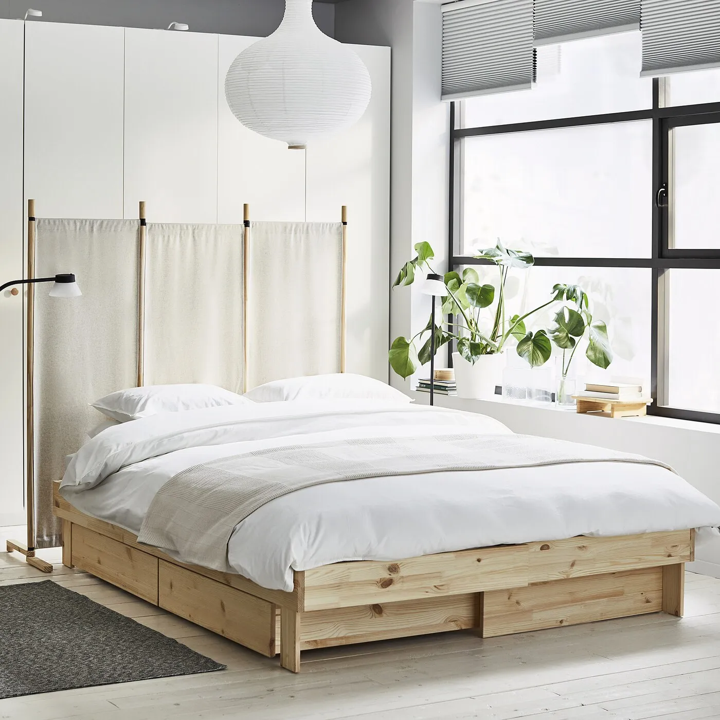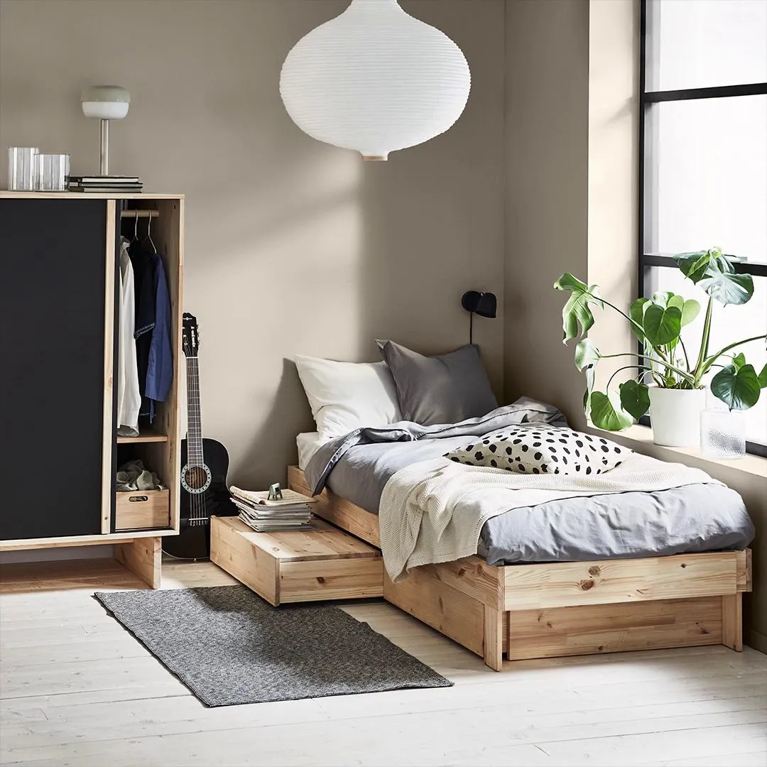 Серия GLAMBERGET — это умная, компактная и многофункциональная мебель. Кровать, которая может подстраиваться под разные размеры матрасов, поставляется с двумя ящиками для хранения и подносами.