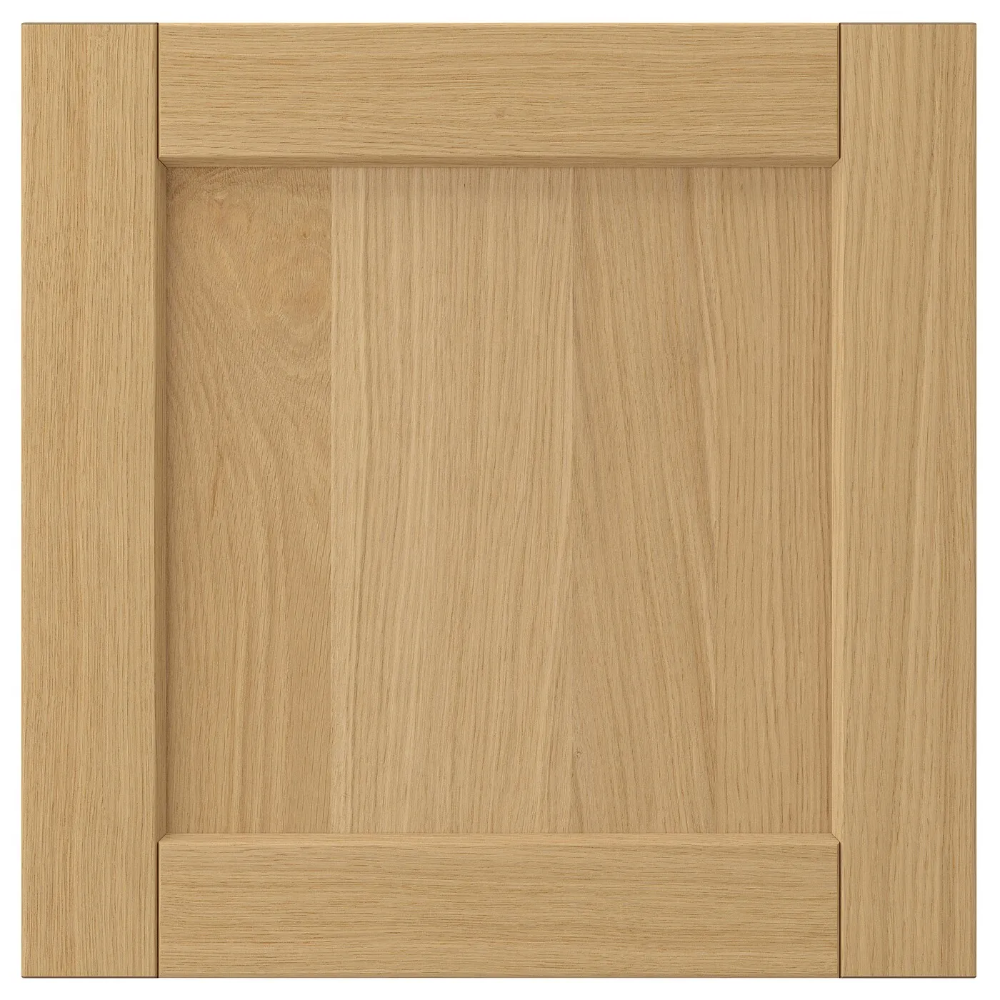 Фасады для кухни FORSBACKA в теплом дубовом шпоне создают уютную и домашнюю атмосферу. Филенчатая дверь с фаской добавляет классический, традиционный характер.